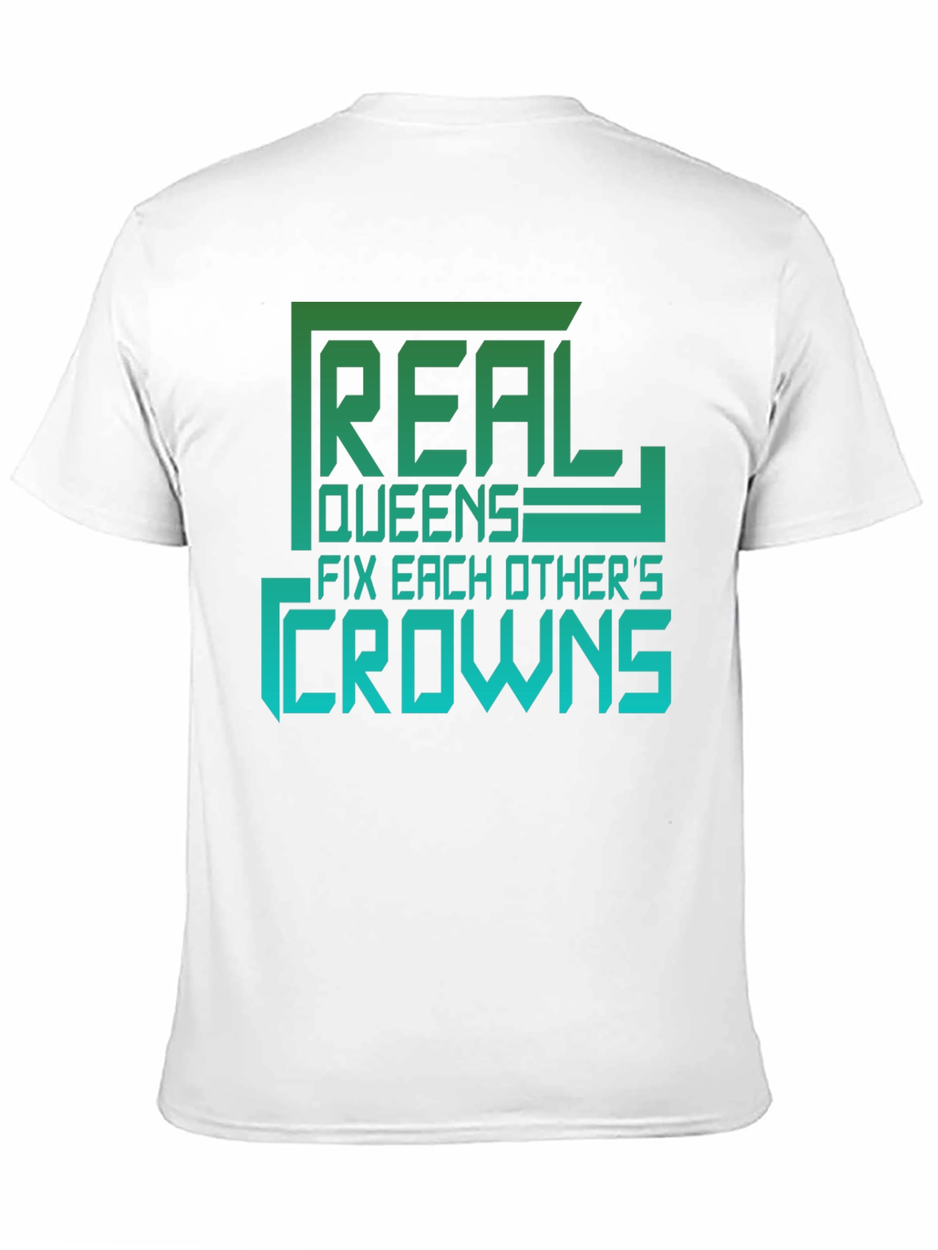 Show your support for strong women with this "Real Queens Fix Each Other's Crowns" t-shirt. The design features eye-catching green and turquoise gradient lettering in a modern, geometric style. Made from a soft and comfortable material, this black tee offers a relaxed fit, ideal for everyday wear. This empowerment message will make a statement. Perfect for casual outings, social gatherings, or as a thoughtful gift for the queens in your life.