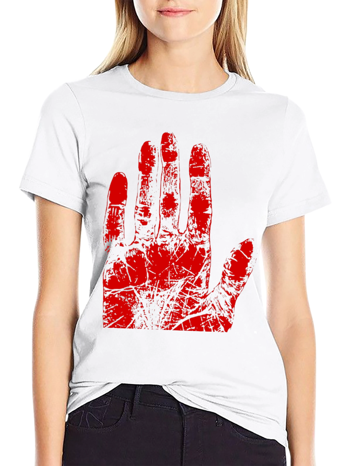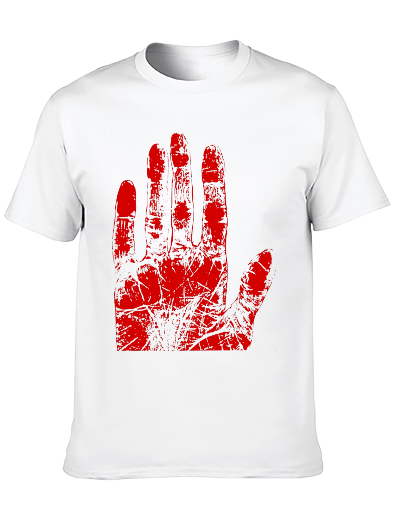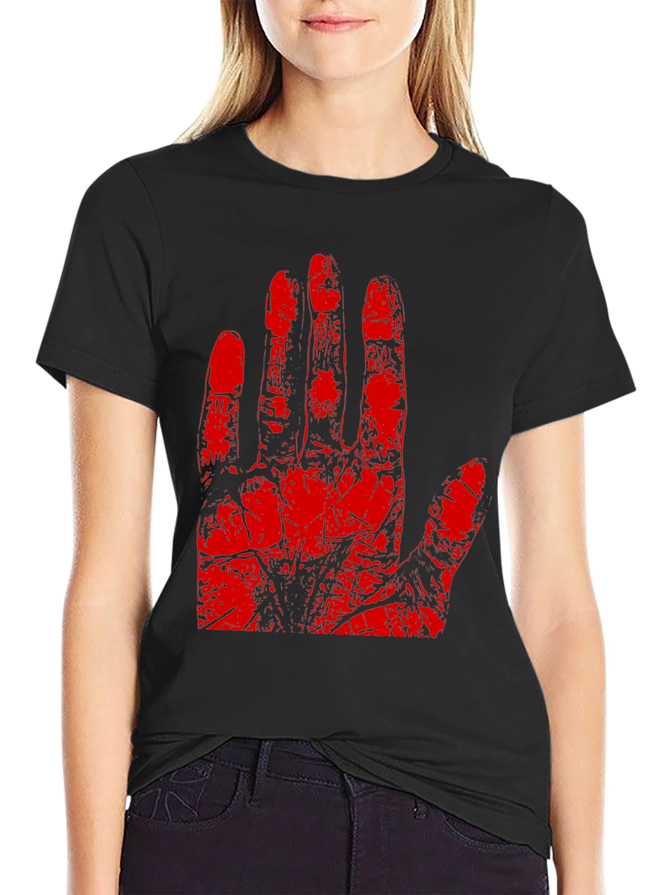 This bold black t-shirt features a striking red hand print design. The graphic is distressed, giving it a unique, edgy look. Crafted from soft cotton, this tee offers comfort and breathability, perfect for everyday wear. The eye-catching design makes a statement, ideal for casual outings or expressing your individual style. Pair it with jeans, shorts, or layer it under a jacket for versatile styling options. This graphic tee is a must-have for those who want to stand out from the crowd.
