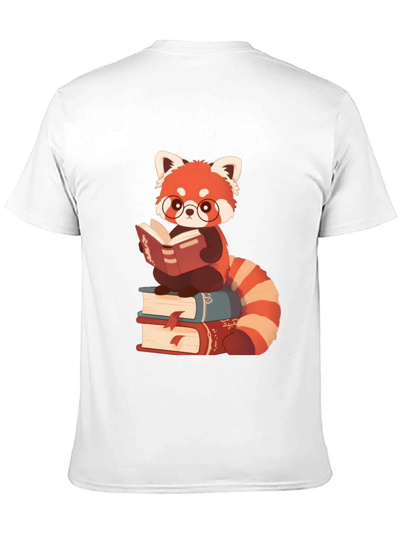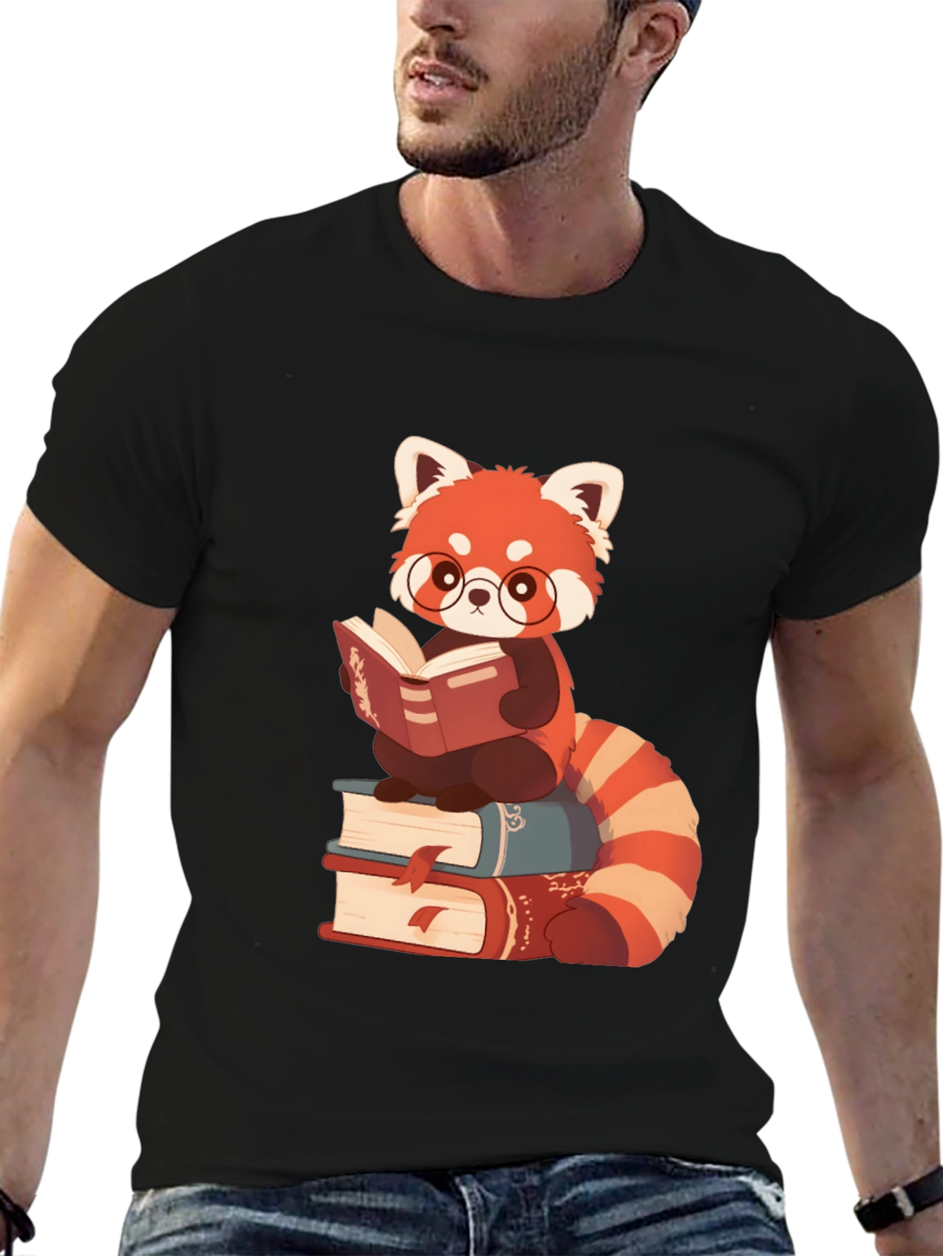 Show off your love for reading and red pandas with this adorable t-shirt! The shirt features a charming cartoon of a red panda wearing glasses, sitting atop a stack of books and engrossed in one of them. The vibrant colors and cute design make it a standout piece. Made from comfortable, breathable fabric, it's perfect for everyday wear. This unique tee is ideal for book lovers, animal enthusiasts, or anyone who appreciates whimsical fashion. Great for casual outings, library visits, or cozy nights in with a good book!
