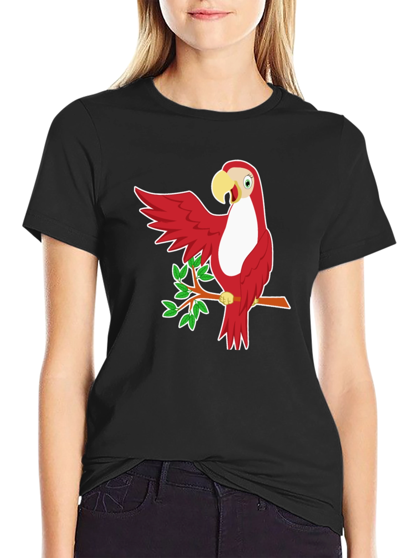 Show off your playful side with this vibrant black t-shirt featuring a cartoon-style red parrot graphic. The cheerful parrot, perched on a branch with green leaves, adds a pop of color and fun to your everyday look. Made from what appears to be a soft and comfortable fabric, this tee is perfect for casual wear. Its classic fit ensures a relaxed and flattering silhouette. Pair it with jeans or shorts for a laid-back weekend vibe, or dress it up with a blazer for a touch of whimsy. This unique tee is sure to be a conversation starter!