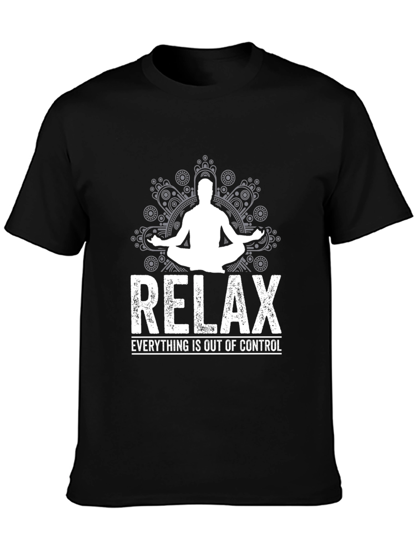 Embrace tranquility with this Relax Out of Control T-shirt. Made from comfortable material, this short-sleeved, black tee features a captivating graphic of a meditating figure surrounded by a detailed mandala design. Below, the words 'RELAX EVERYTHING IS OUT OF CONTROL' are printed in bold, white letters. Perfect for yoga enthusiasts, those seeking mindfulness, or anyone with a sense of humor, this shirt is a stylish reminder to let go and find peace amidst the chaos of everyday life. A unique addition to any casual wardrobe, it pairs effortlessly with jeans, shorts, or leggings for a comfortable and expressive look. Get yours today and wear your zen attitude!