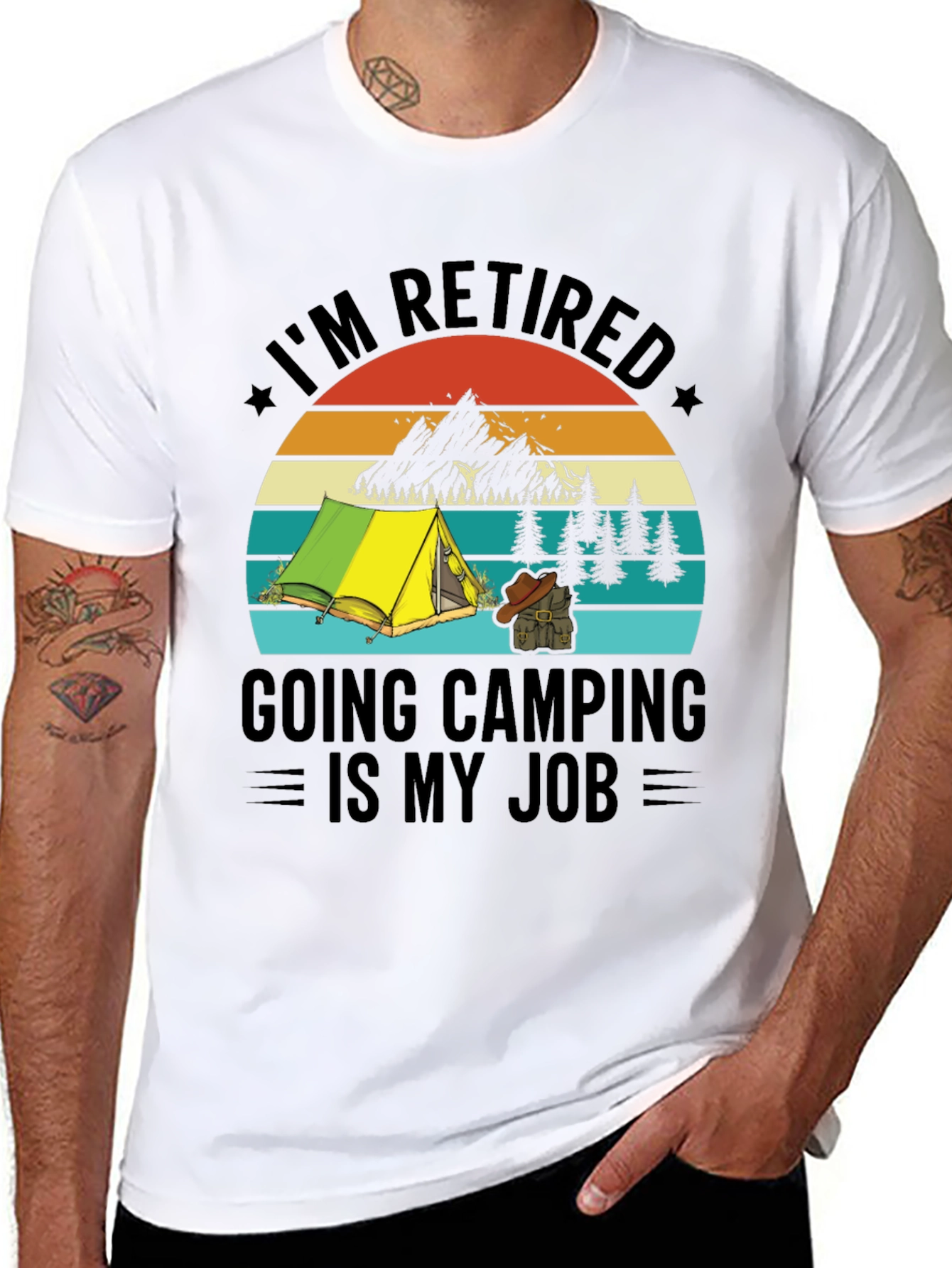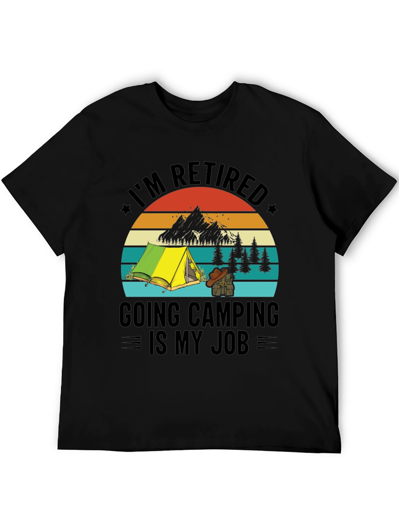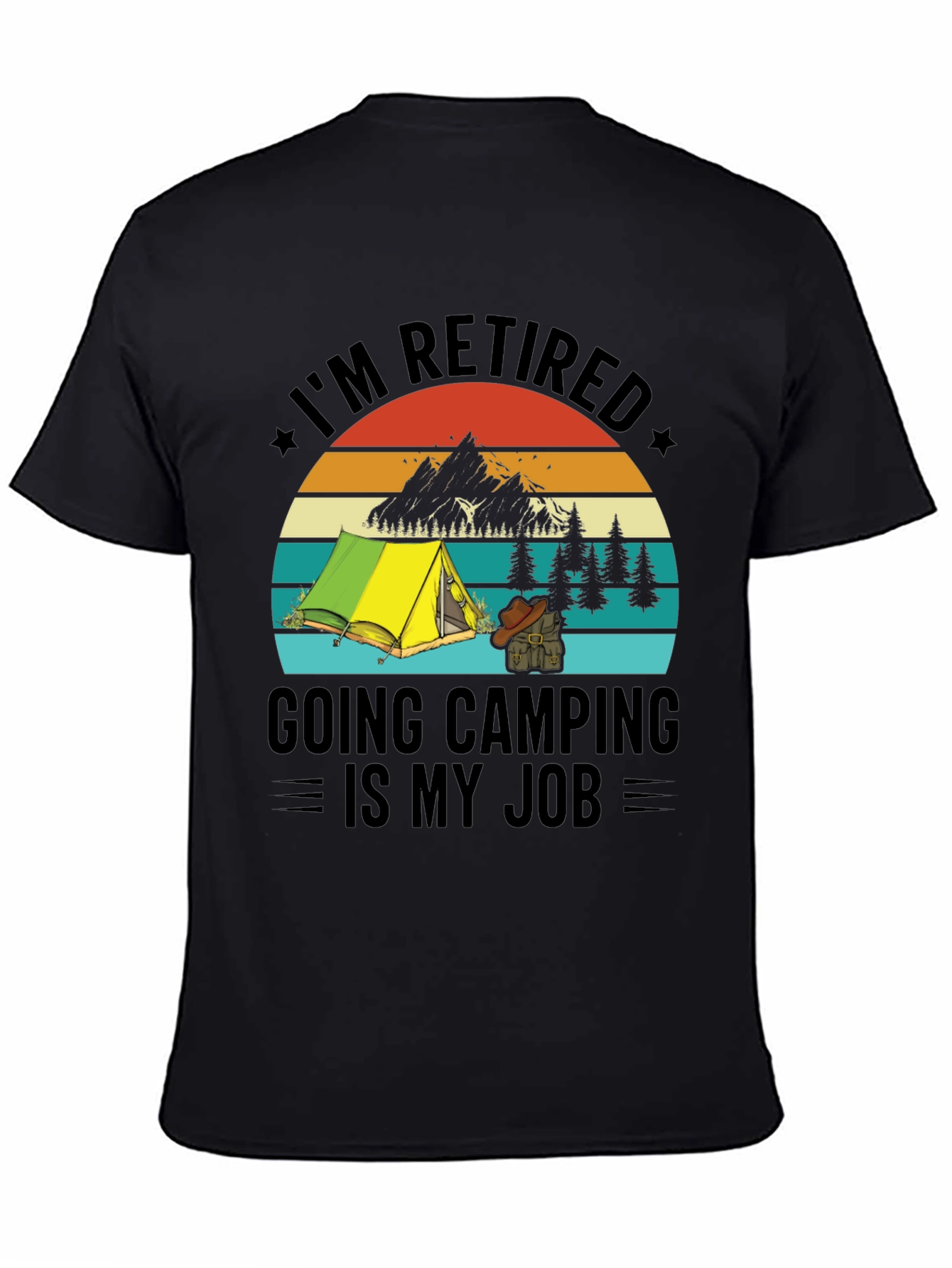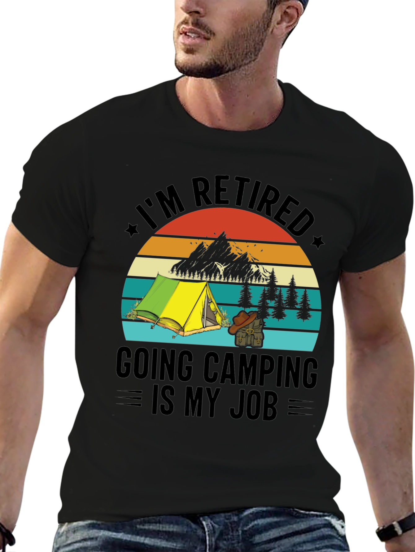 Embrace your golden years with this "I'm Retired, Going Camping Is My Job" T-shirt. Made of comfortable, breathable fabric, it features a vibrant graphic of a mountain scene, tent, and camping gear against a retro sunset backdrop. This tee is perfect for outdoor adventures, casual wear, or as a humorous gift for the newly retired. Show off your love for camping and your well-deserved freedom with this stylish and comfortable shirt!