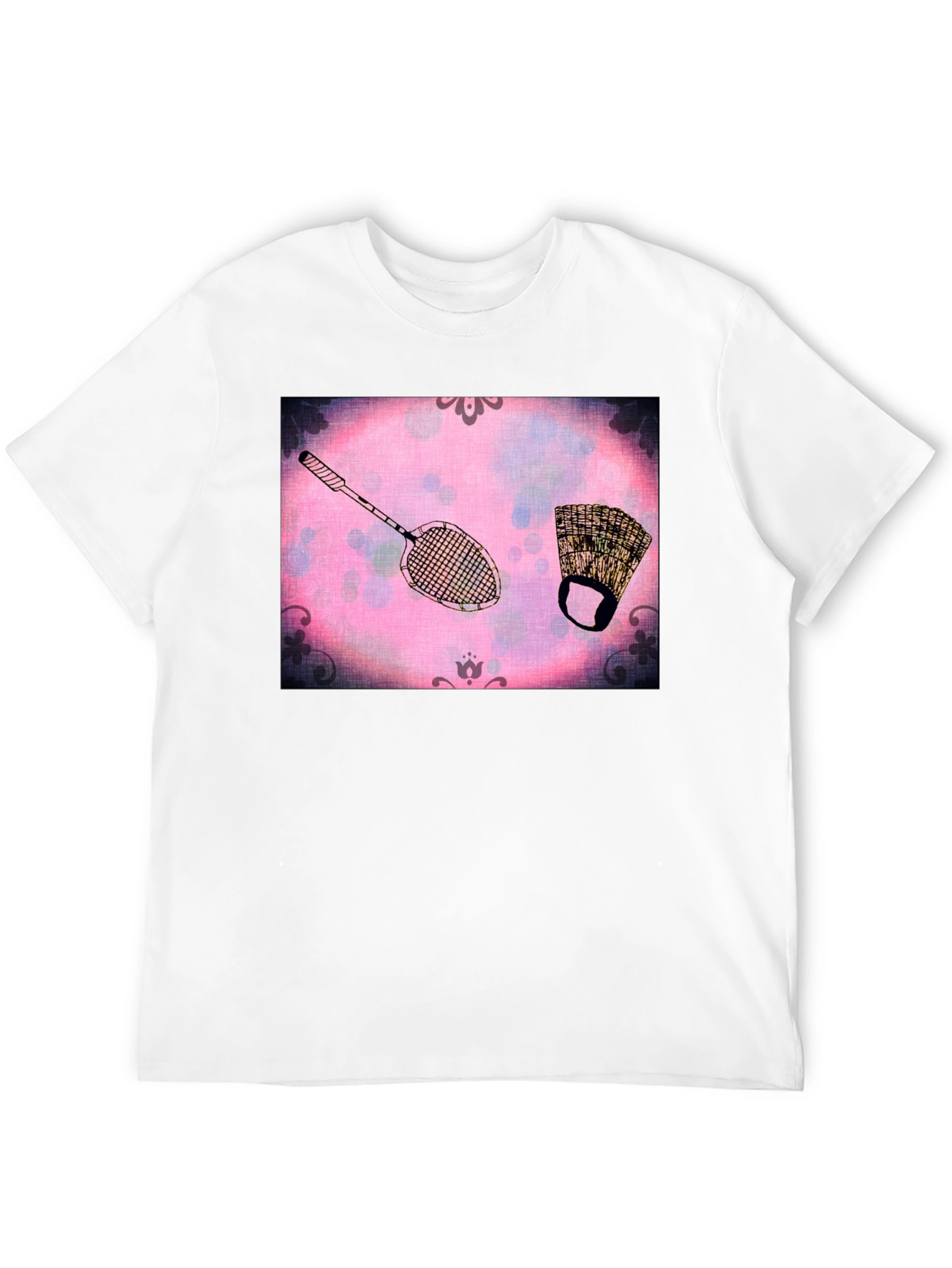 Showcase your love for classic sports with this unique graphic t-shirt. The design features a retro badminton racquet and shuttlecock illustration, set against a textured, vintage-inspired backdrop with floral elements. The print has a square format, with a slight grunge for an authentic vintage feel. The t-shirt itself is a classic crew neck style and appears to be made from a comfortable, soft fabric. Perfect for casual wear, sports enthusiasts, or anyone who appreciates a touch of retro style. Add a unique piece to your wardrobe with this eye-catching tee.