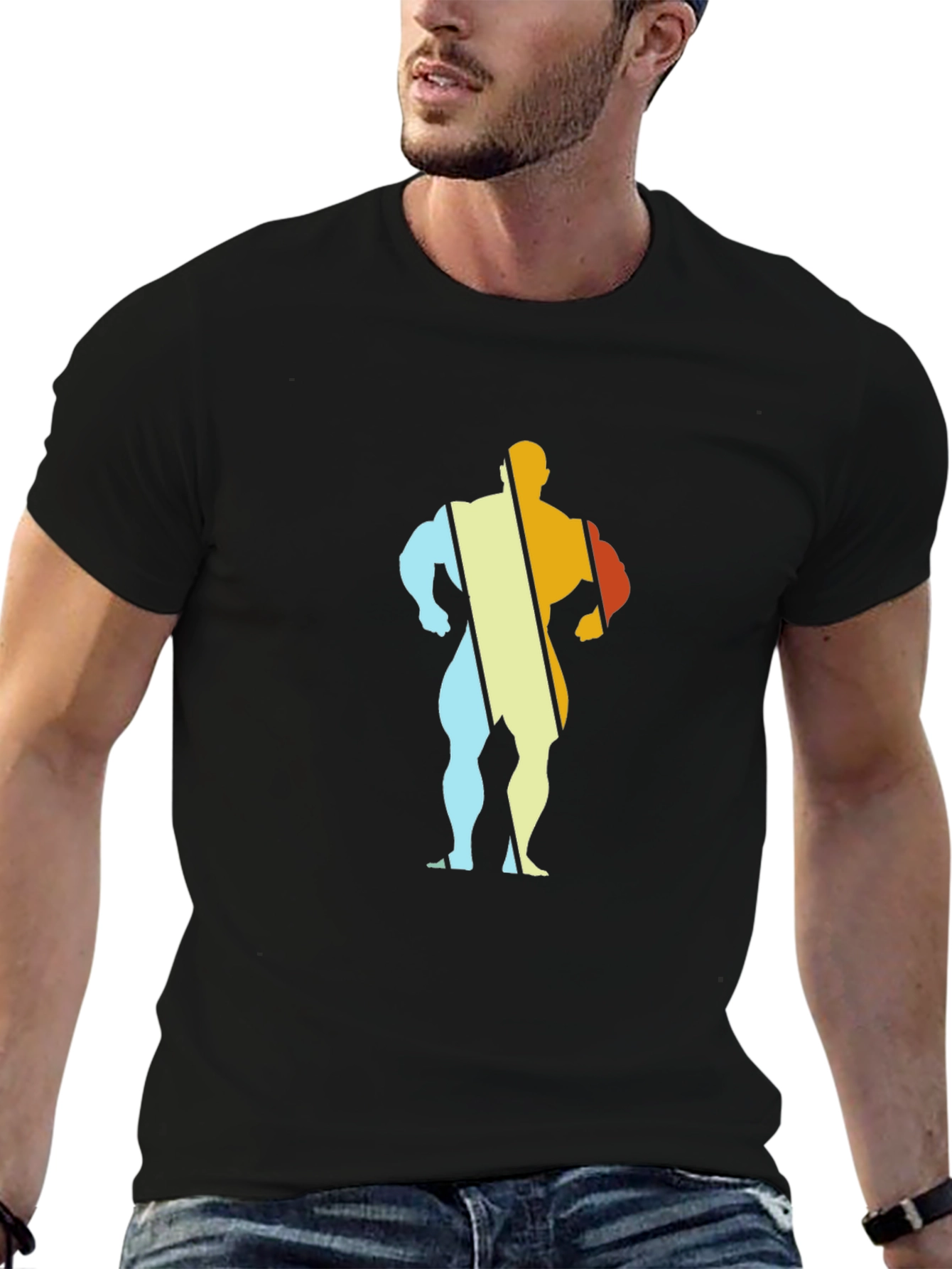 Show off your fitness passion with this eye-catching black t-shirt. Featuring a vintage-inspired bodybuilder silhouette graphic in faded retro colors, this tee is perfect for the gym, casual wear, or making a statement. Crafted from comfortable cotton fabric, it offers a relaxed fit for all-day wear. The design combines a classic aesthetic with a modern edge, making it a versatile addition to any wardrobe. Durable and stylish, this t-shirt is ideal for anyone who loves fitness and retro style. Wear it proudly to showcase your dedication to a healthy lifestyle.