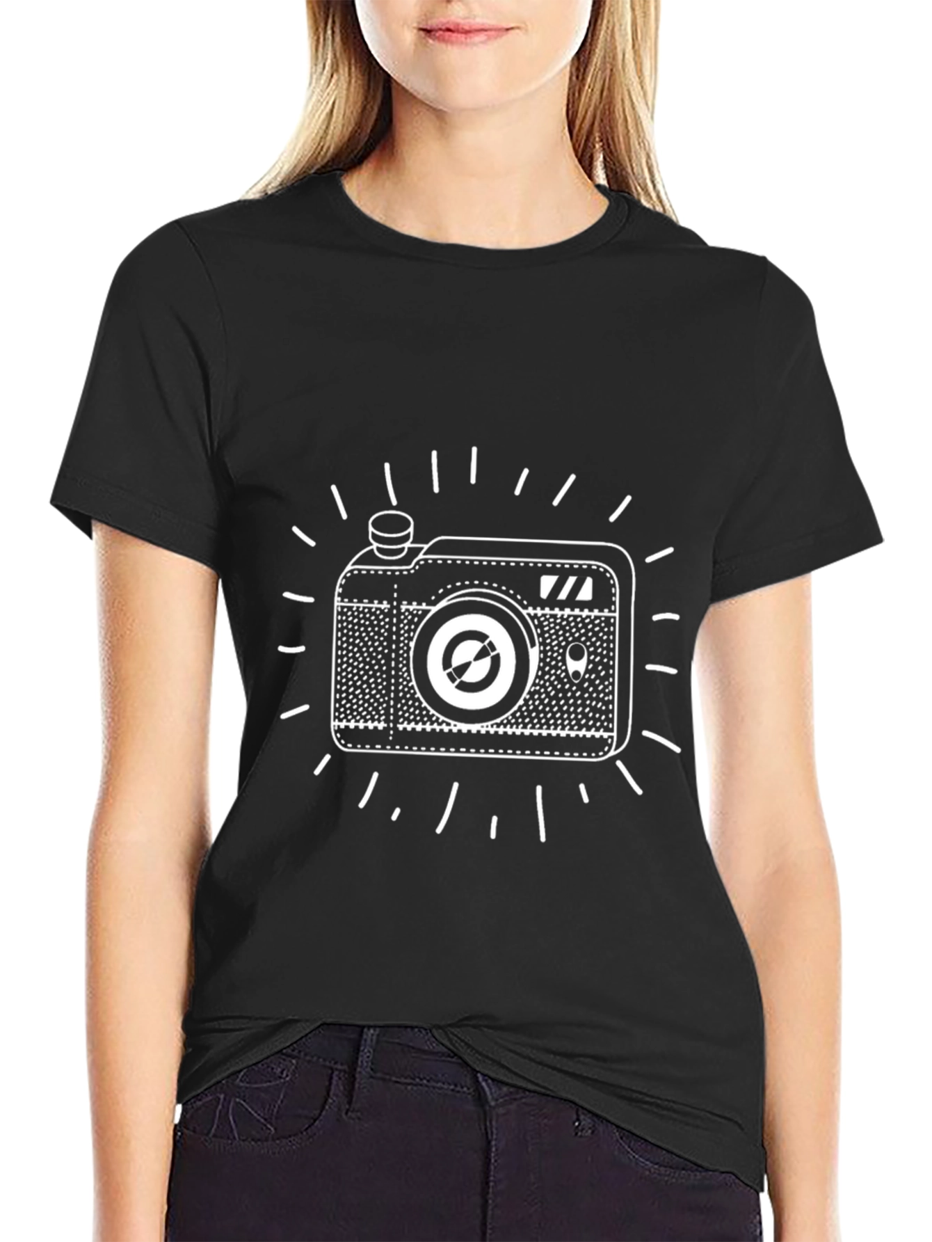 Capture attention with this stylish black t-shirt featuring a unique retro camera graphic. The eye-catching design is printed in white, creating a striking contrast against the dark fabric. Made from comfortable materials, this tee is perfect for everyday wear. Its classic fit ensures a relaxed and flattering look for all body types. Ideal for photographers, vintage enthusiasts, or anyone who appreciates distinctive style, this t-shirt adds a touch of personality to any outfit. Pair it with jeans, shorts, or a jacket for a casual yet fashionable statement. Stand out from the crowd with this must-have graphic tee. Express your interests and style.