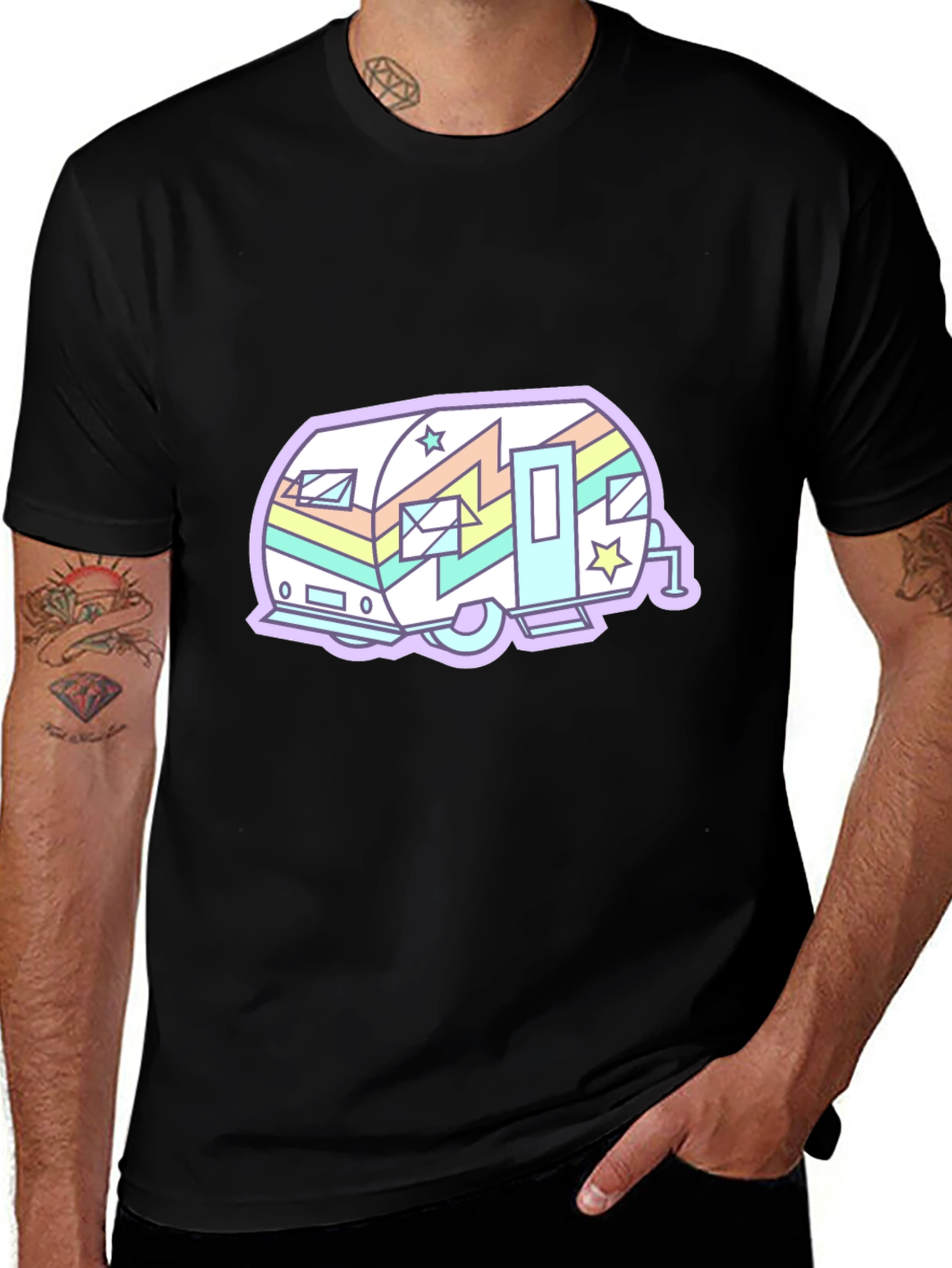 Rock a nostalgic vibe with this black t-shirt featuring a vibrant, retro-style camper graphic. The design showcases a classic camper with a pastel outline and colorful stripes. The tee appears to be made from a comfortable, breathable fabric, ideal for everyday wear. This unique shirt is perfect for camping enthusiasts, vintage lovers, or anyone looking to add a fun, quirky touch to their wardrobe. Pair it with jeans or shorts for a relaxed, stylish look. Stand out from the crowd with this eye-catching conversation starter!