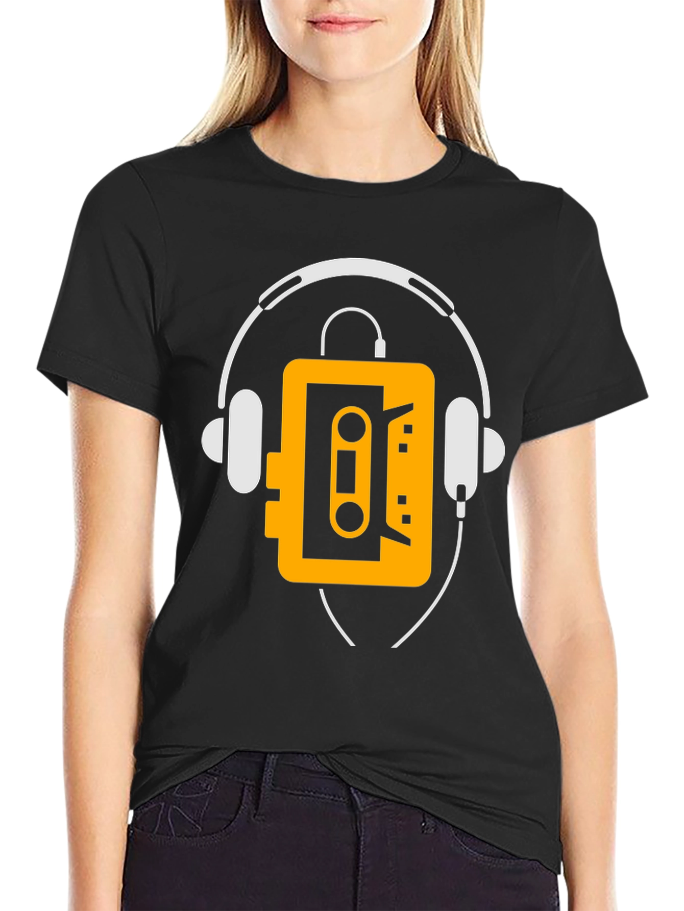 Step back in time with this eye-catching black t-shirt featuring a bold graphic print. The design showcases a retro yellow cassette player with a set of white headphones, creating a cool and nostalgic vibe. Made from a soft, comfortable fabric, this tee is perfect for casual wear, music lovers, or anyone who appreciates vintage aesthetics. The striking contrast of the yellow and white graphic against the black background ensures you'll stand out in style. Whether you're hitting the streets, attending a concert, or just relaxing at home, this tee is a must-have addition to your wardrobe. Embrace the retro revolution!