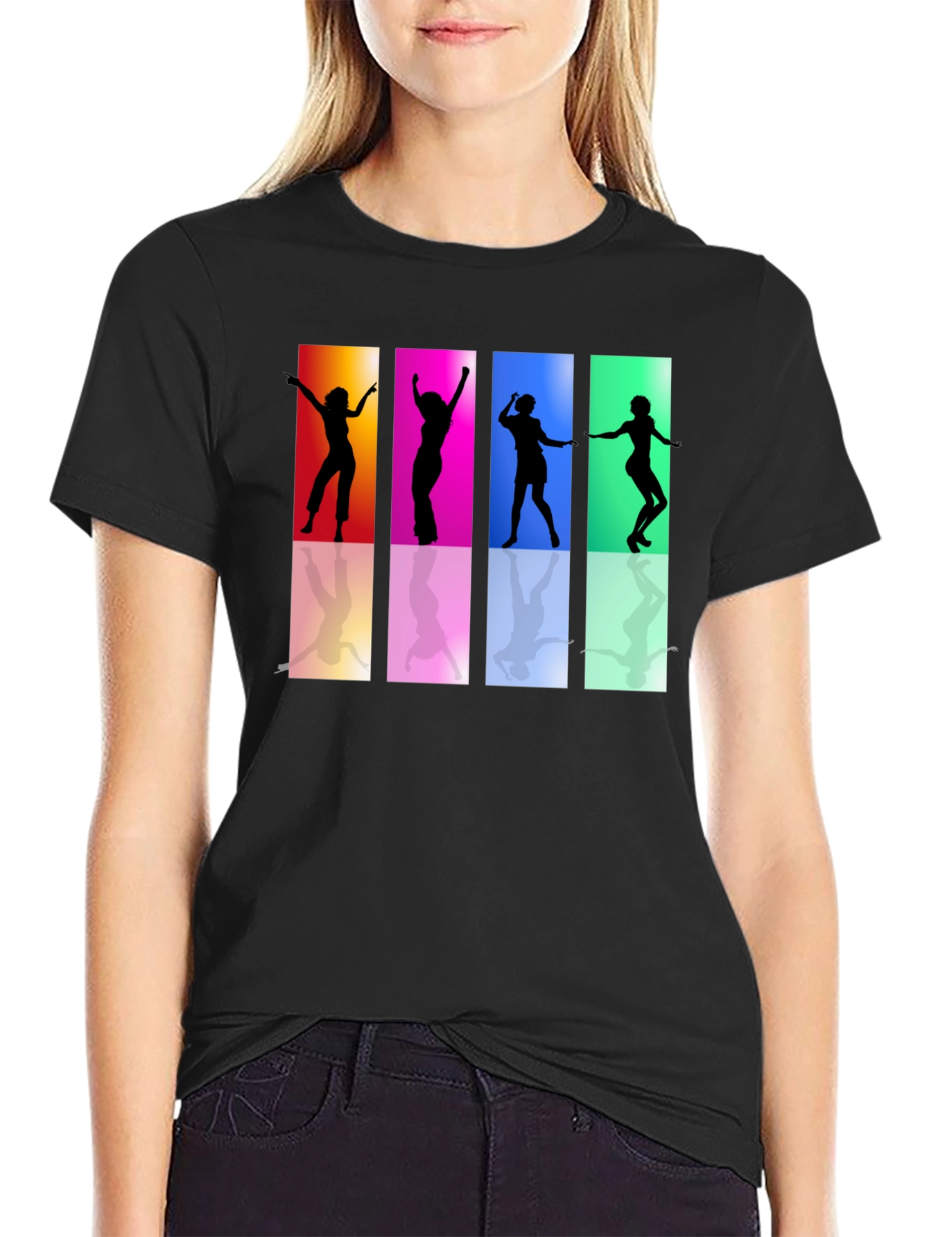 Get your groove on with this stylish black t-shirt featuring a retro dance silhouette design! This eye-catching graphic showcases vibrant, colorful panels each displaying a unique dancer's silhouette and their reflections. Made from a comfortable, presumably cotton blend, this tee is perfect for expressing your love for music and dance. Wear it casually with jeans or dress it up for a night out. This unique shirt is sure to start a conversation and showcase your fun personality. A perfect gift for dancers, music lovers, and anyone who appreciates a touch of retro style. Grab yours today and let the music move you!