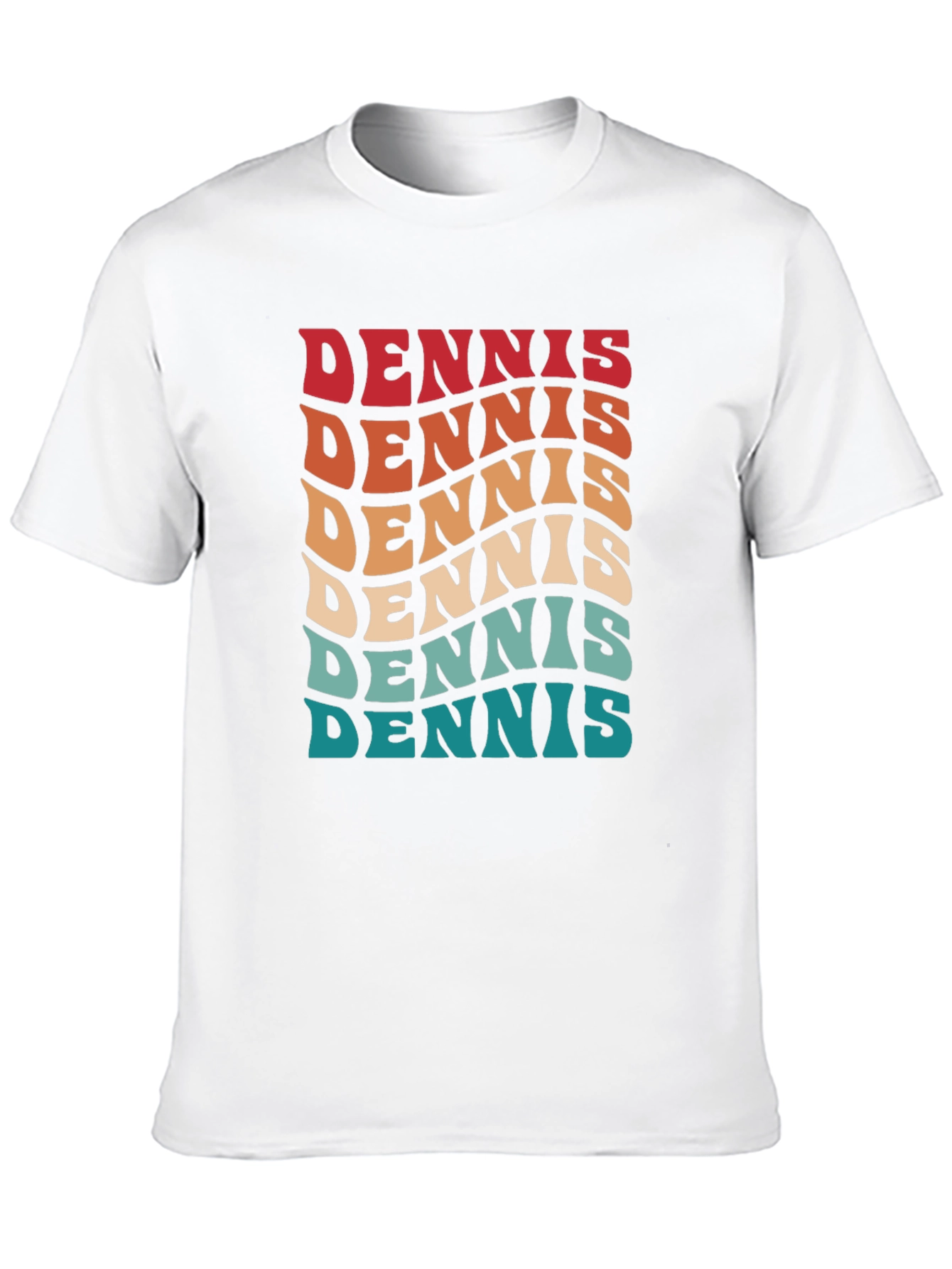 Show off your love for all things vintage with this awesome retro "Dennis" name t-shirt! The bold black tee provides a sleek backdrop for the eye-catching, wave-patterned name design. "Dennis" is displayed multiple times in a stacked format, with colors transitioning from red and orange to a cool teal, capturing a groovy 70s vibe. Perfect for casual wear, this tee is sure to turn heads and spark conversations. Pair it with your favorite jeans or shorts for a stylish and comfortable look. Make a statement and celebrate your unique style!