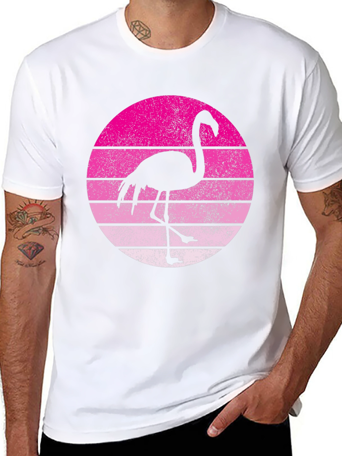 Embrace a touch of tropical flair with this unique graphic tee. Featuring a bold flamingo silhouette set against a retro-style sunset backdrop, this shirt is sure to turn heads. The design incorporates vibrant pink and white horizontal stripes, creating a visually appealing contrast. Constructed from a soft, breathable fabric, this T-shirt offers all-day comfort and durability. Its classic crew neck and short sleeves make it a versatile addition to any wardrobe. Pair it with jeans for a casual outing, or dress it up with a blazer for a more refined look. Perfect for summer days, beach vacations, or anyone who loves a pop of color and vintage charm. Add this stylish flamingo tee to your collection and elevate your everyday style!
