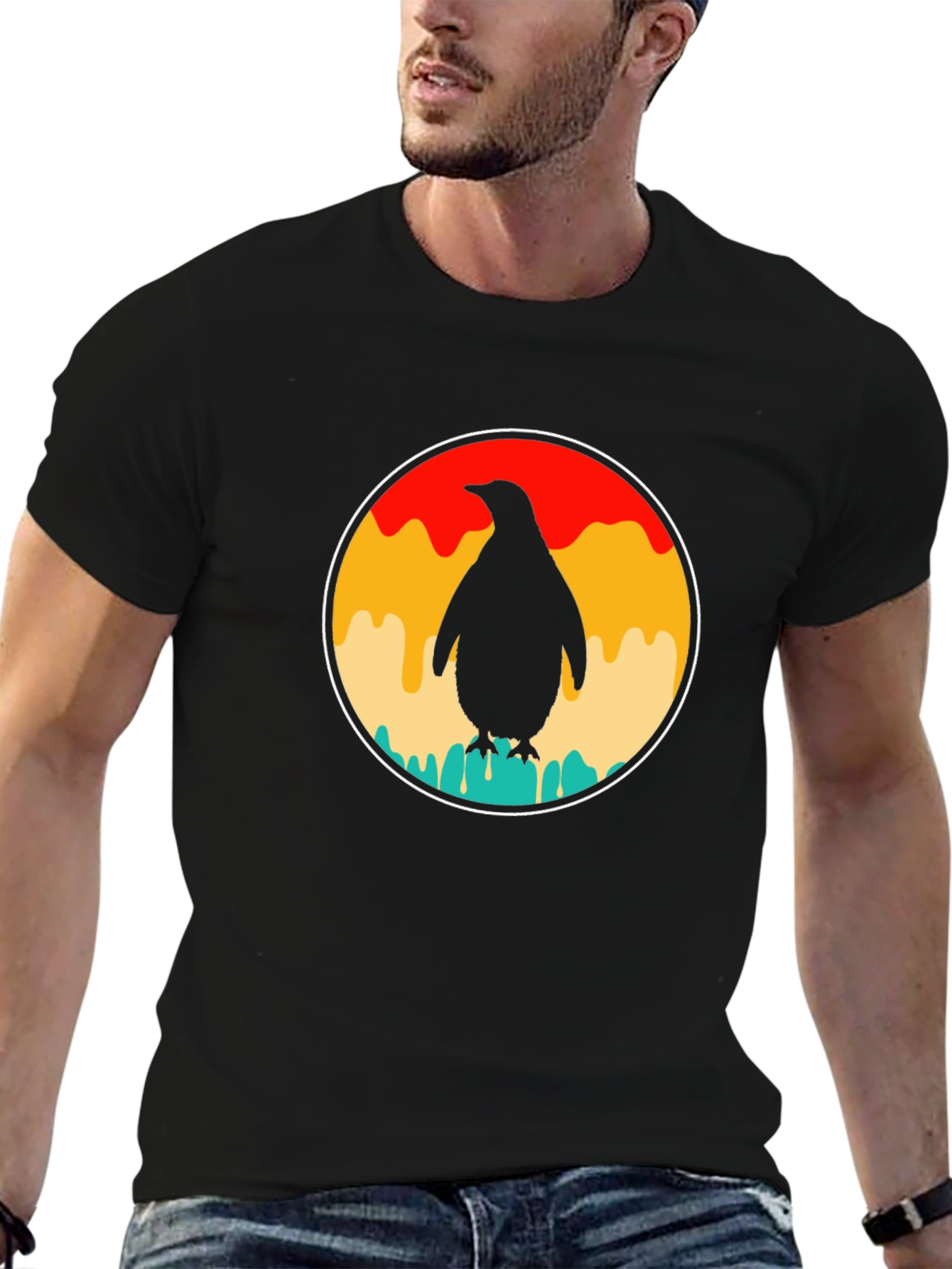 Show off your love for penguins with this stylish black t-shirt. Featuring a retro-inspired design with a silhouetted penguin inside a colorful circle, this tee offers a unique and eye-catching look. The vintage-style background blends red, yellow, and teal in a fun and playful way. Made from a soft and comfortable fabric, this t-shirt is perfect for everyday wear. Pair it with jeans, shorts, or a casual jacket for a relaxed yet fashionable outfit. This tee is an excellent choice for animal lovers and anyone looking to add a touch of retro flair to their wardrobe.