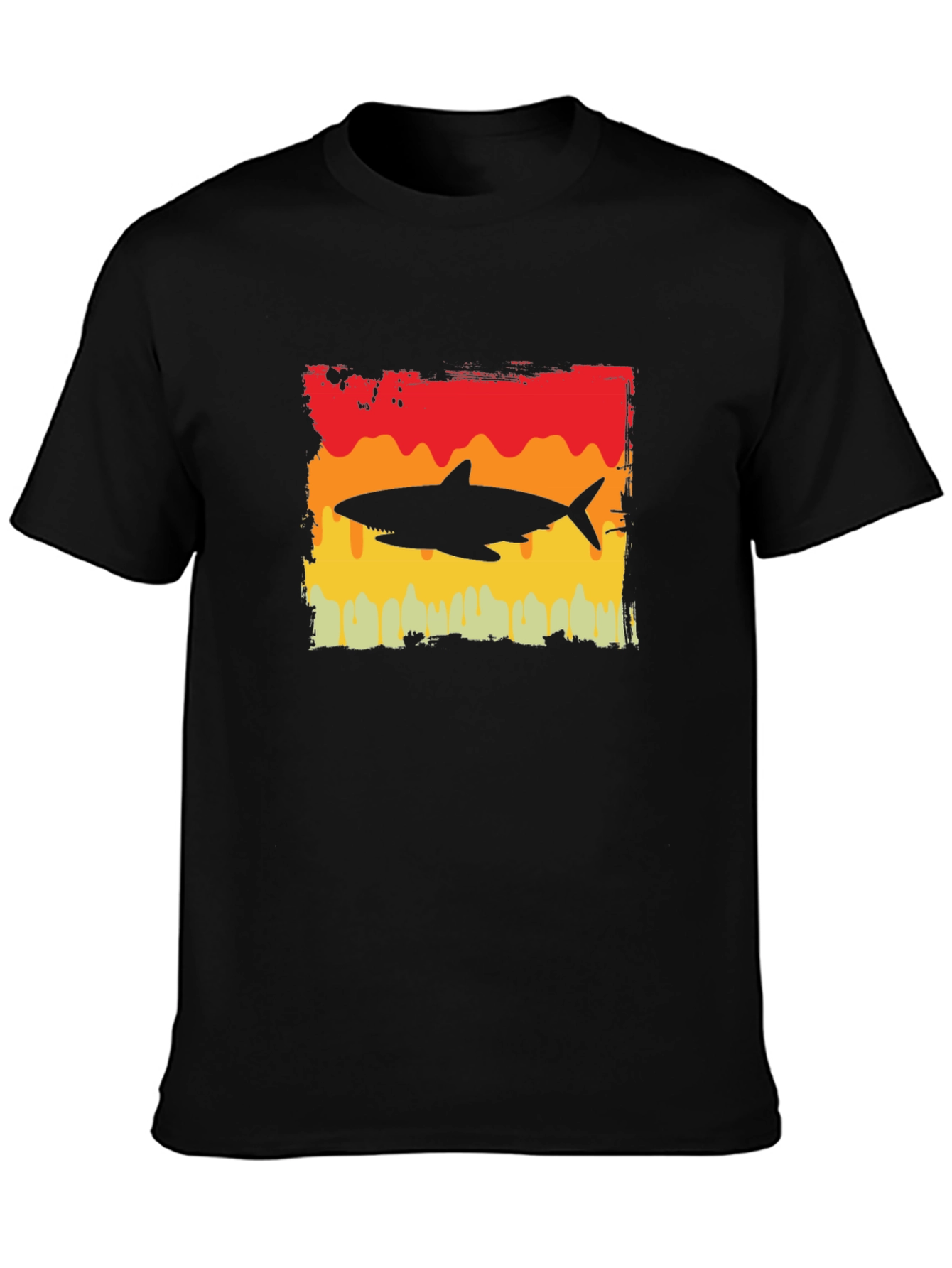 Dive into style with this eye-catching black T-shirt featuring a bold retro shark graphic. The design showcases a striking shark silhouette set against a vibrant, textured background of red, orange, and yellow hues. Crafted from soft, breathable cotton, this tee offers both comfort and durability. The unique graphic adds a touch of edgy personality, making it perfect for casual outings, beach trips, or everyday wear. Stand out from the crowd and express your love for the ocean with this must-have shark tee. Pair it with jeans or shorts for a relaxed, cool look. A great gift for shark enthusiasts!