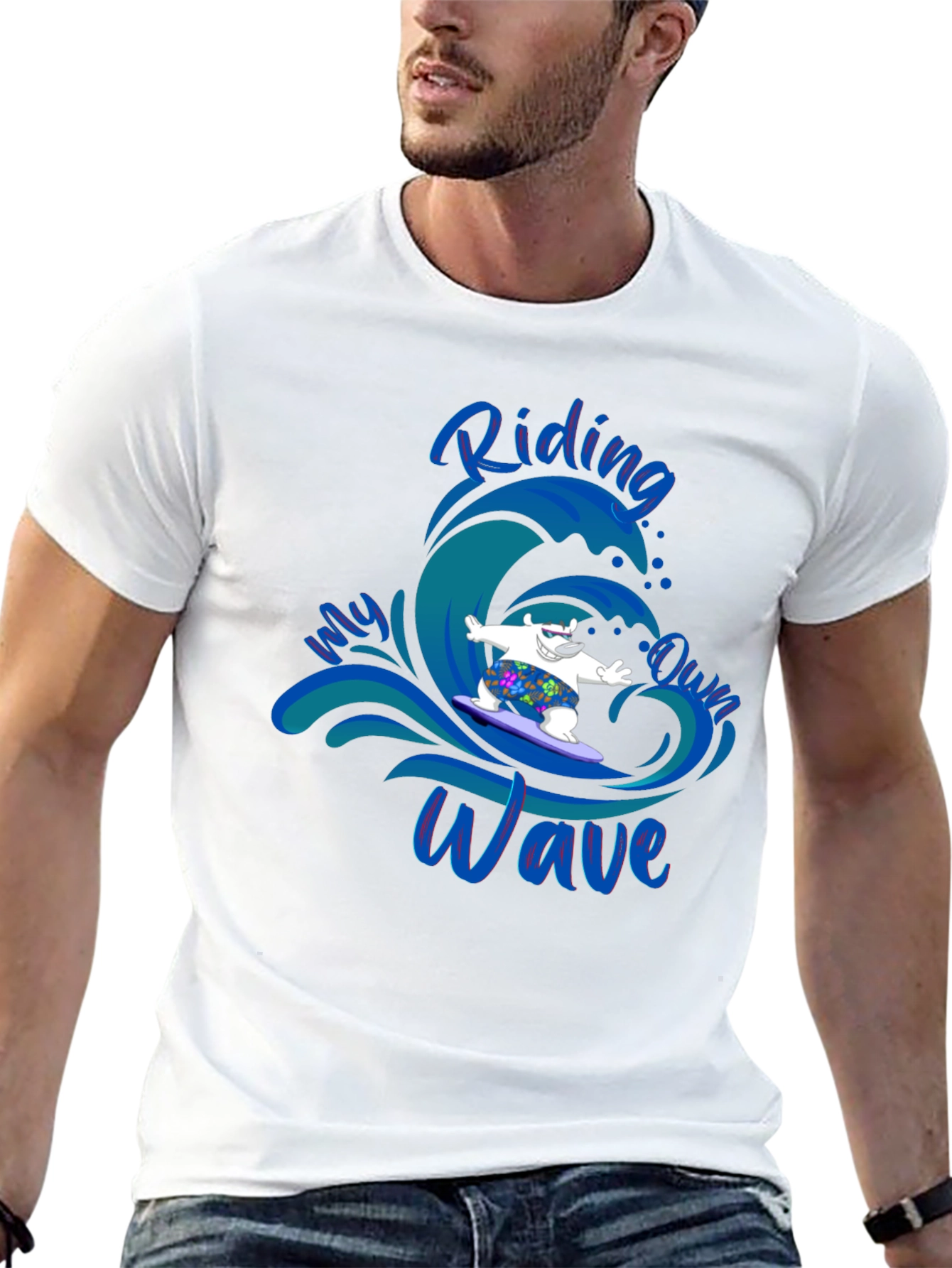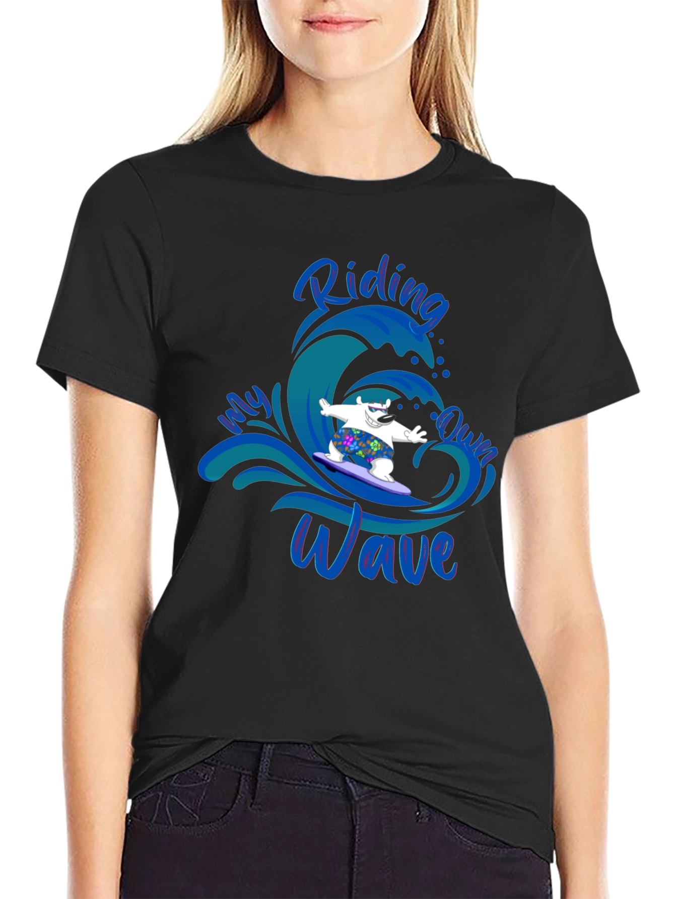 Show off your cool, confident attitude with this unique graphic t-shirt. The black tee features a fun design of a cartoon bear riding a wave, accompanied by the phrase "Riding My Own Wave" in stylish blue lettering. Made from a comfortable-looking fabric, this shirt is perfect for casual wear, beach outings, or expressing your individuality. The vibrant colors and playful design will surely make a statement and turn heads wherever you go. Get ready to catch some waves and ride in style!