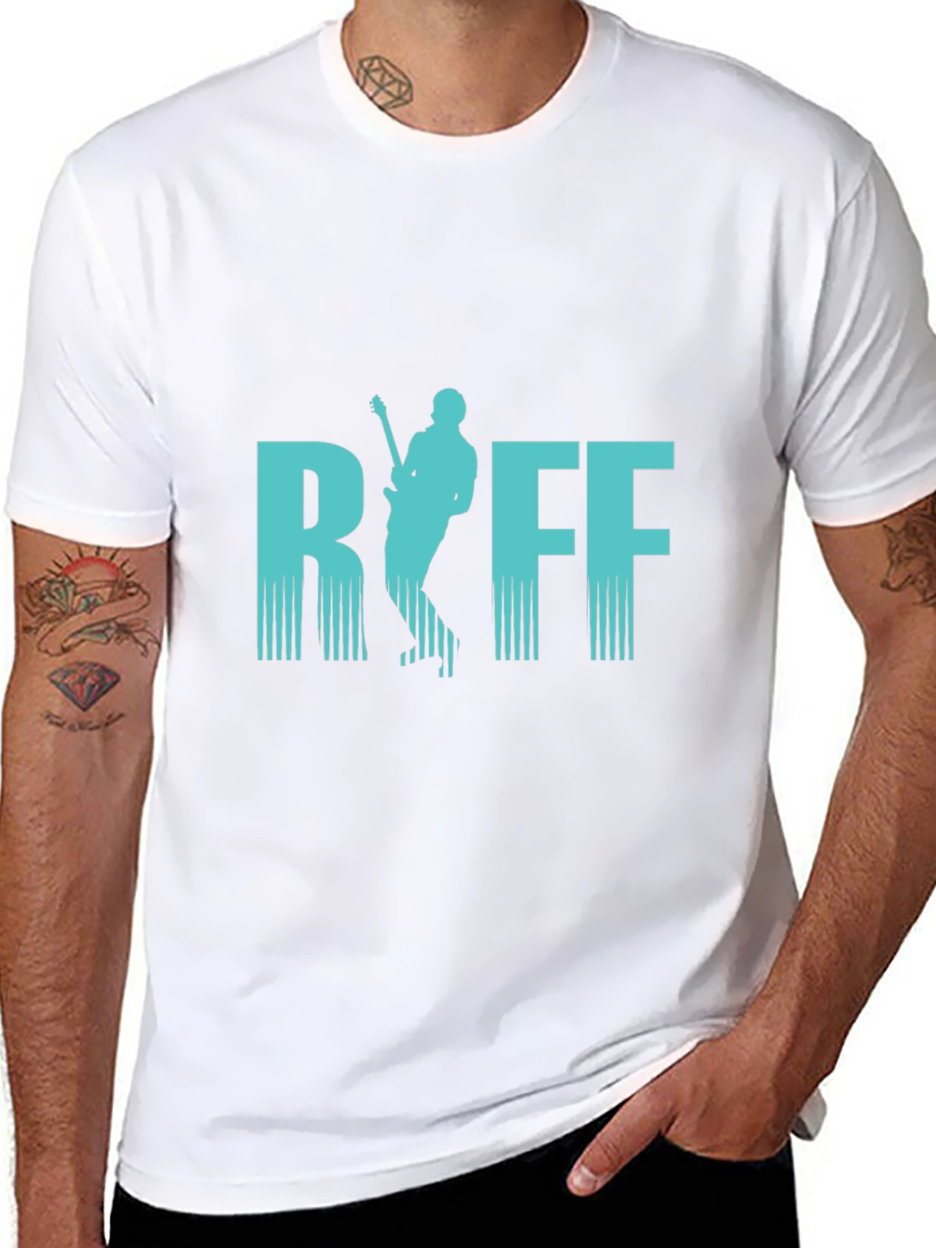 Rock your style with this eye-catching Riff graphic tee! This classic black t-shirt features a bold, light blue 'RIFF' design, complete with a musician silhouette integrated within the letters. The unique design is sure to appeal to guitarists and music lovers alike. Made from comfortable, breathable fabric, this shirt is perfect for everyday wear, concerts, or casual gatherings. Show off your passion for music with this stylish and unique tee. Get yours today!