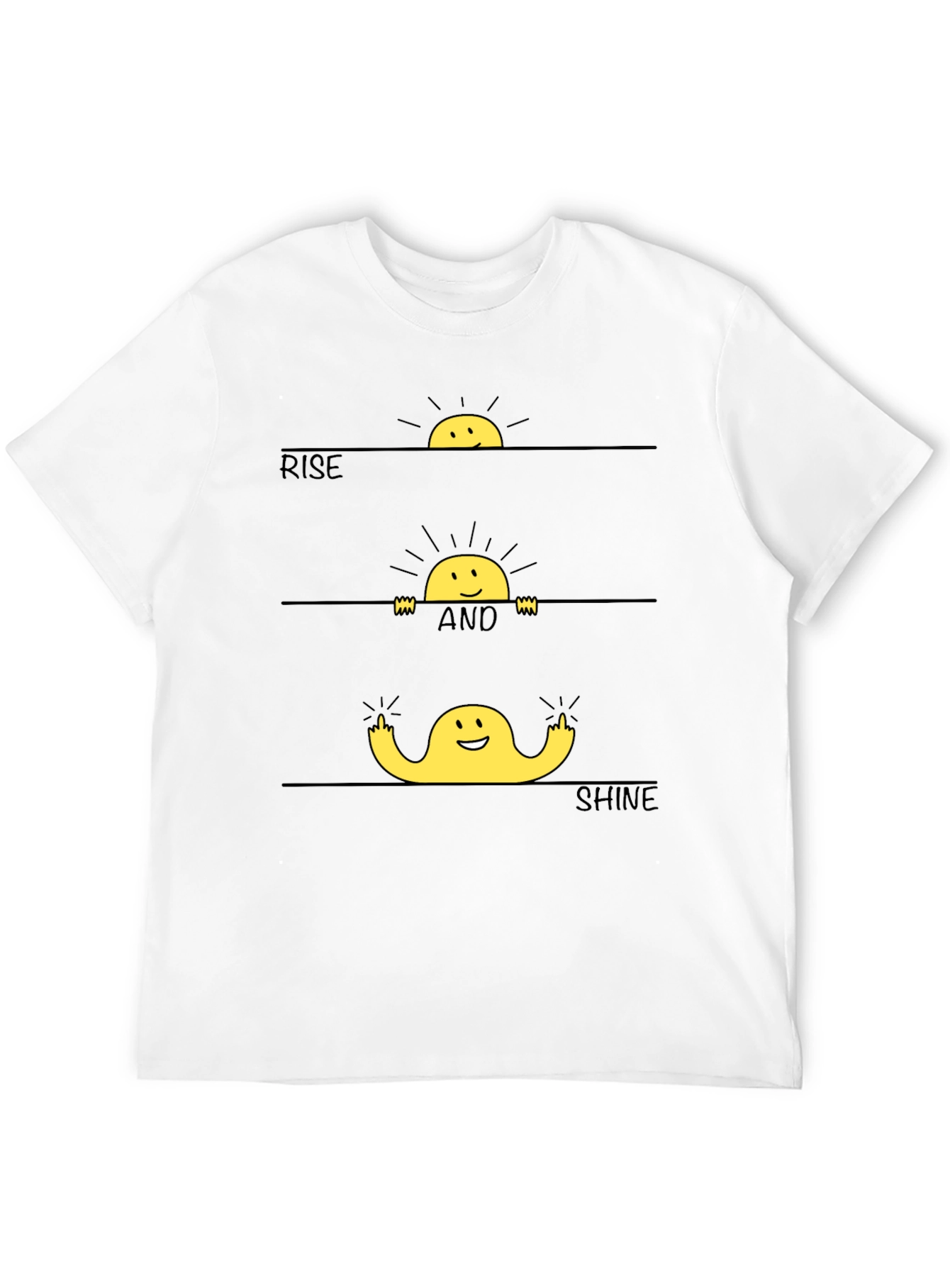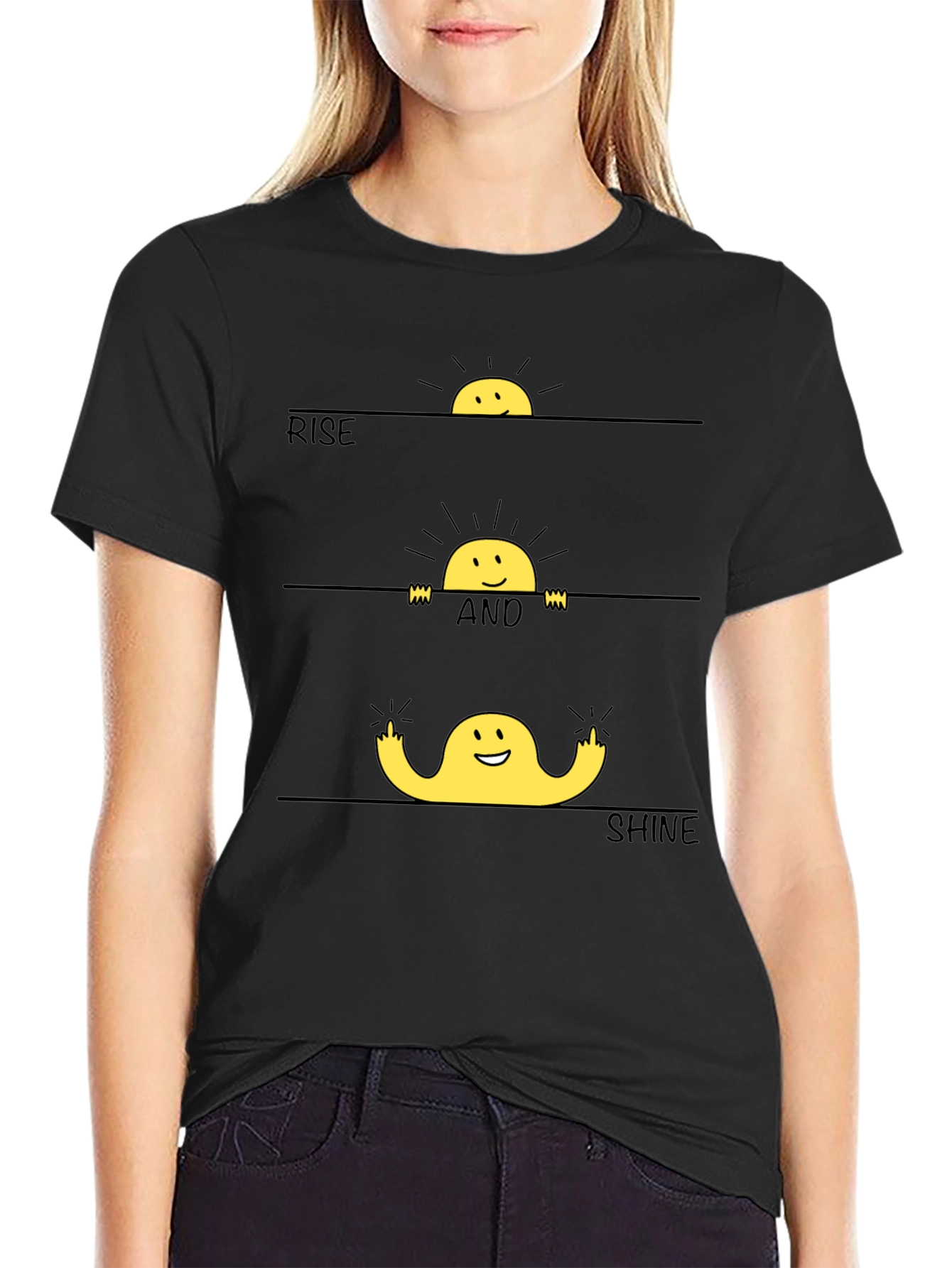 This trendy black t-shirt features a playful and eye-catching "Rise and Shine" graphic. The design incorporates three smiling suns peeking over horizontal lines, creating a unique and cheerful look. Made from a soft-looking, comfortable fabric, this short-sleeved shirt is perfect for casual wear. The bold graphic is sure to spark conversations and spread positivity wherever you go. Pair it with jeans or shorts for a relaxed, everyday style. Express your sunny disposition with this must-have t-shirt!