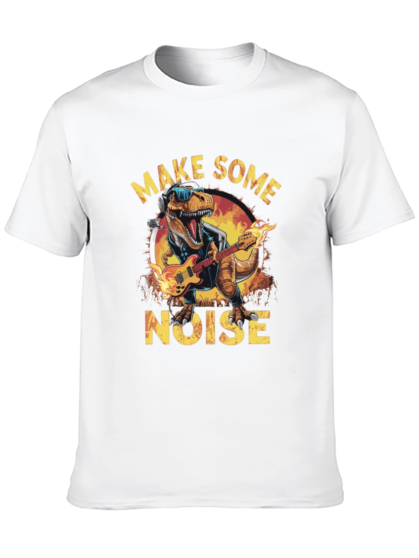 Unleash your inner rockstar with this unique graphic tee. Featuring a cool dinosaur shredding on a flaming guitar, this black t-shirt is a statement piece. The design incorporates the words "MAKE SOME NOISE" in a bold, eye-catching font. Perfect for casual wear, concerts, or simply showing off your love for music and dinosaurs. Made from comfortable fabric for all-day wear. Express your unique style with this must-have tee. Grab yours today and let the world know you're ready to rock!