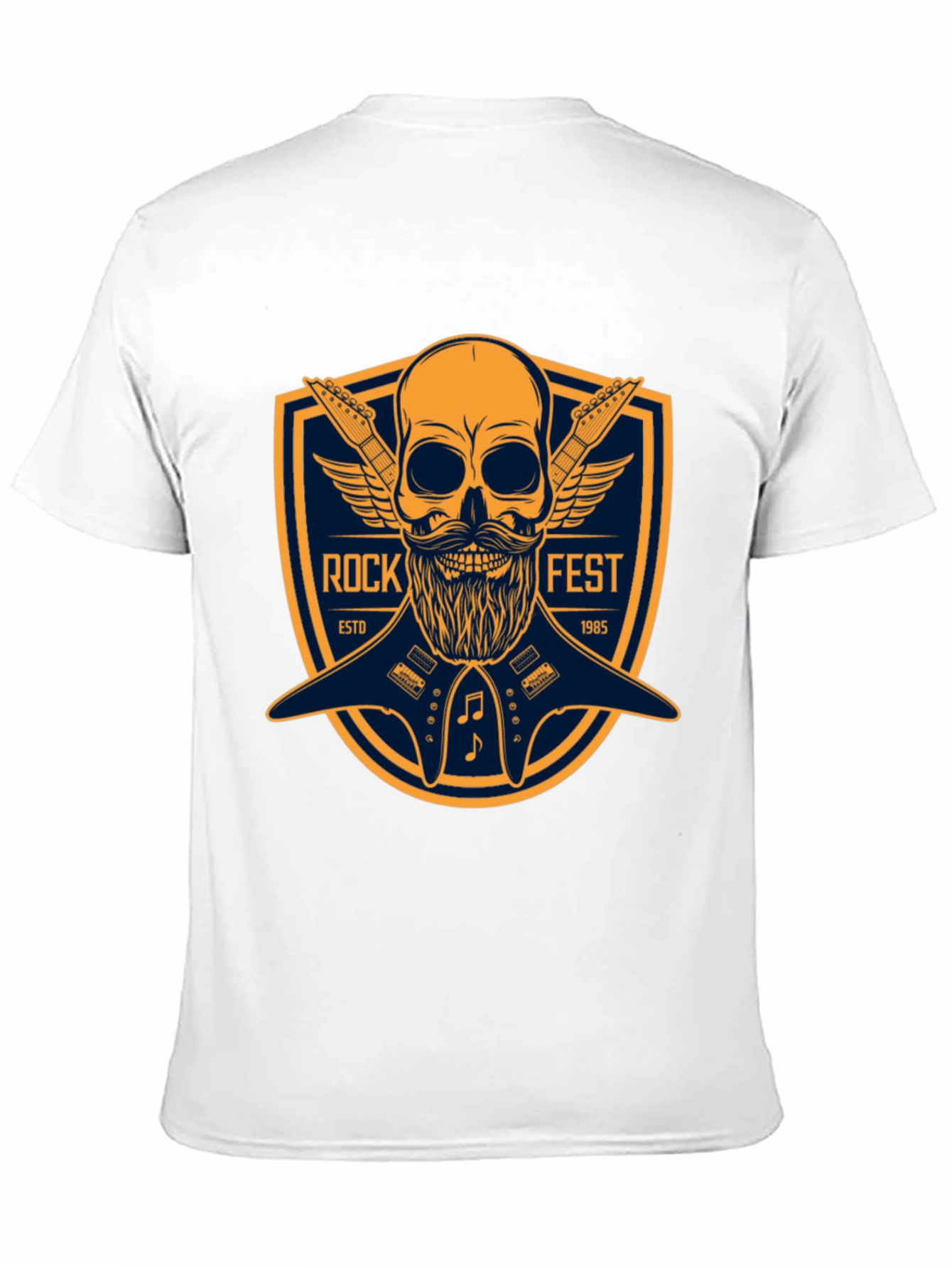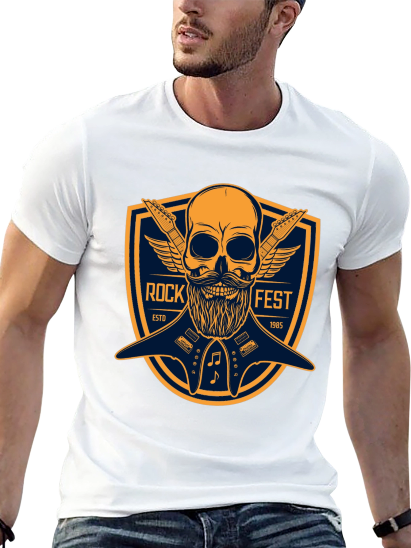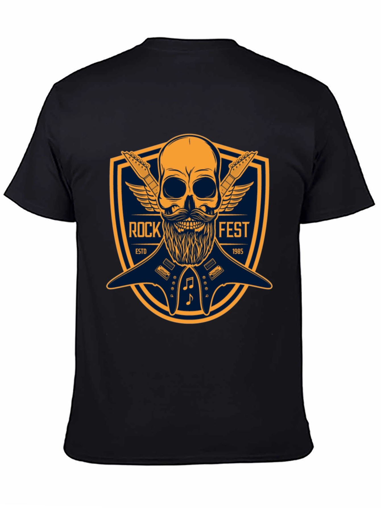 Show off your rocker style with this unique graphic tee. The black t-shirt features a bold design showcasing a skull with a beard of guitar necks, wings, and guitars crossing behind the skull in the style of crossed swords. The graphic also contains the phrase "Rock Fest" with the years of the rock festival underneath. The design pops with its gold and blue color scheme. This comfortable and stylish tee is perfect for music lovers, concerts, casual wear, or making a statement. Made from a soft and breathable fabric, this t-shirt is sure to become a wardrobe favorite. Get yours today!