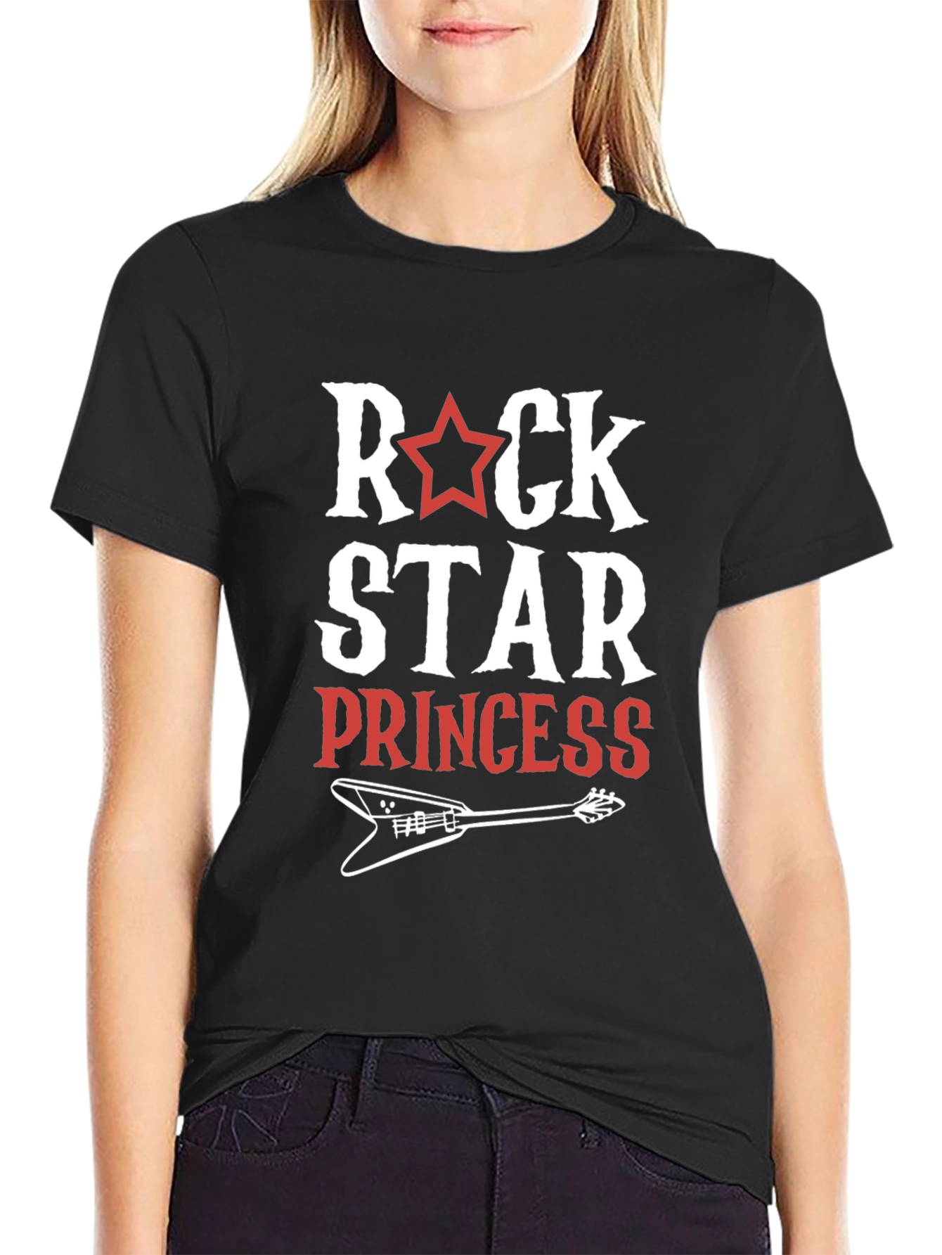 Showcase your inner rock royalty with this stylish black T-shirt. The design features the words "ROCK STAR PRINCESS" in a bold font, complemented by a red star. A stylized electric guitar graphic adds a playful touch. Made from a soft, comfortable fabric, this T-shirt is perfect for everyday wear or for making a statement at concerts and casual outings. Pair it with jeans or a skirt for a fun, edgy look. This T-shirt is ideal for anyone who loves music and wants to express their unique personality.