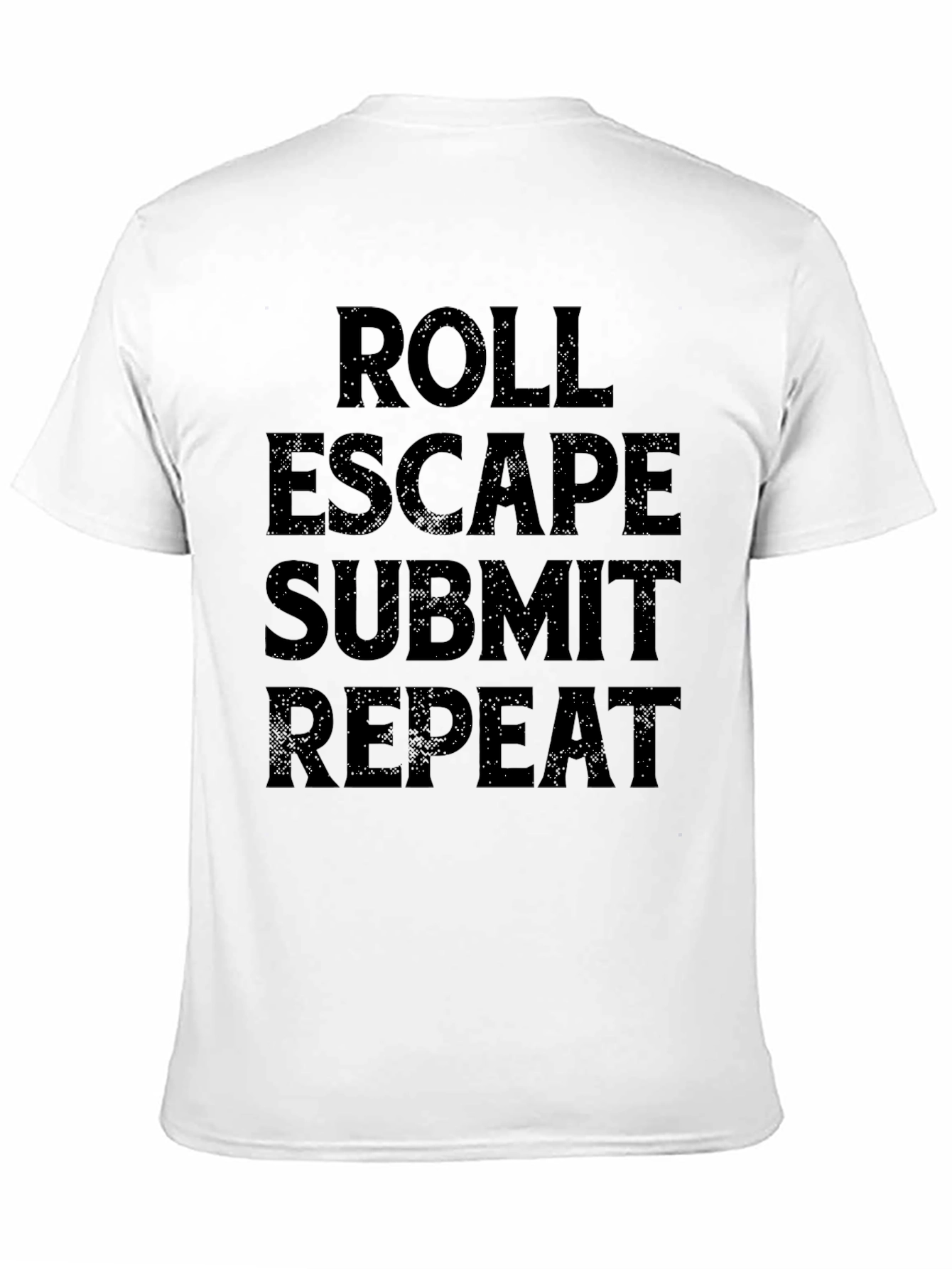 This classic black t-shirt features a bold, eye-catching print that reads "Roll Escape Submit Repeat". The print has a slightly textured appearance, providing a unique, vintage-inspired aesthetic. Made from a comfortable-looking fabric, this tee is perfect for casual wear or workout sessions. Its short sleeves and relaxed fit make it ideal for warm weather. Show off your active lifestyle with this unique and stylish t-shirt. Whether you're hitting the gym or hanging out with friends, this shirt will keep you comfortable and looking sharp.