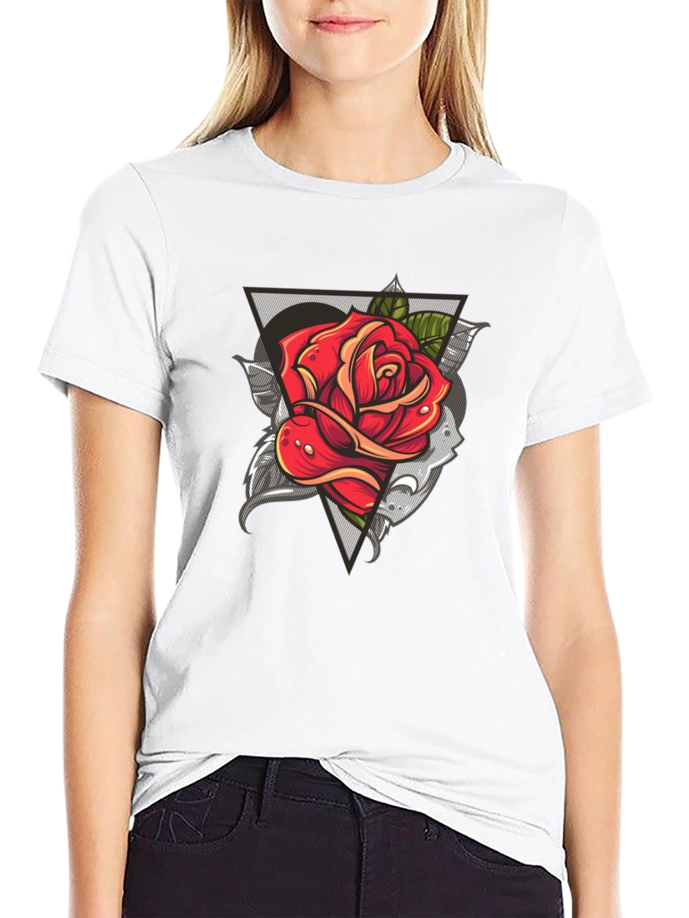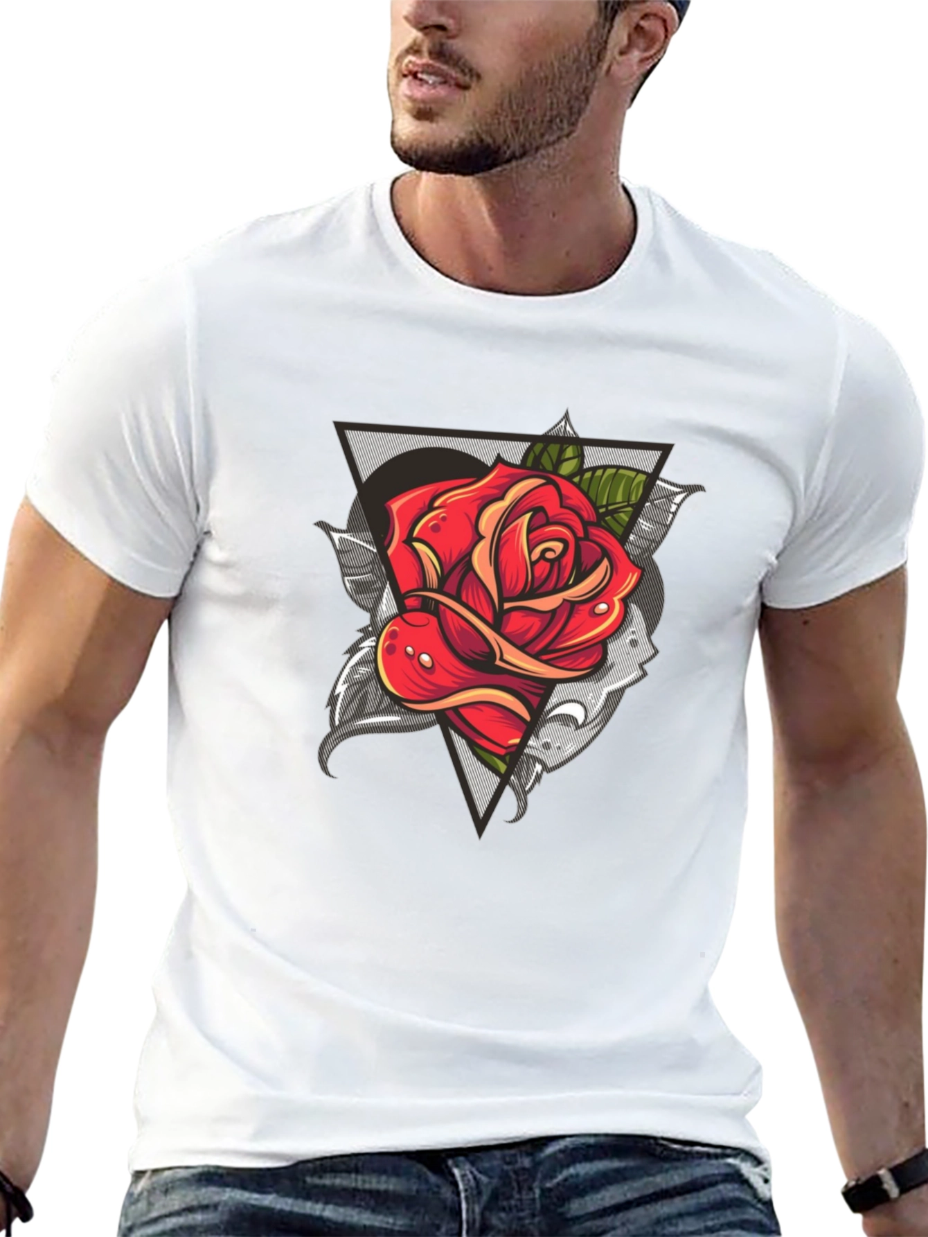 Elevate your casual style with this striking black t-shirt. This modern tee features a vibrant rose graphic design enclosed in a gray triangle, creating a bold, eye-catching look. The rose is detailed with red petals, green leaves and gray thorn accents. Made from comfortable, breathable fabric, this t-shirt is perfect for everyday wear. Ideal for casual outings, streetwear fashion, or adding a touch of edgy sophistication to any outfit. Pair it with jeans, shorts, or joggers for a versatile, stylish look. This tee is a must-have for those who appreciate unique graphic designs and contemporary fashion.
