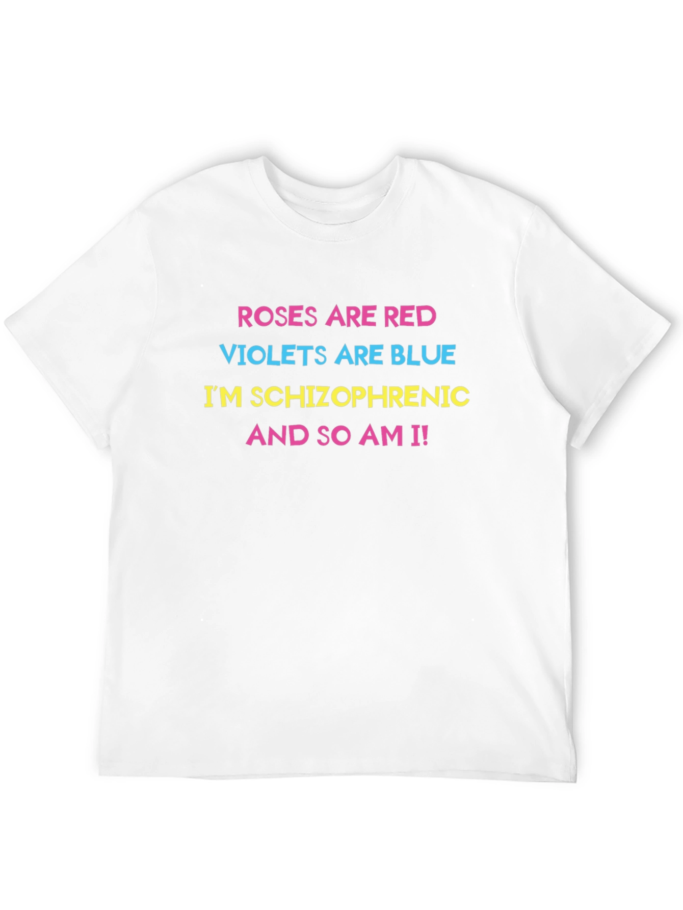 This unique black t-shirt features a humorous take on the classic poem, "Roses are red, violets are blue." In eye-catching vibrant colors, the text declares "Roses are red, violets are blue, I'm schizophrenic, and so am I!" This tee is crafted from a comfortable material, ideal for casual wear. It's a great conversation starter and a fun way to express your quirky sense of humor. Perfect for everyday wear, parties, or as a lighthearted gift for someone with a similar sense of humor. Pair it with jeans, shorts, or your favorite casual bottoms for a relaxed and humorous look.