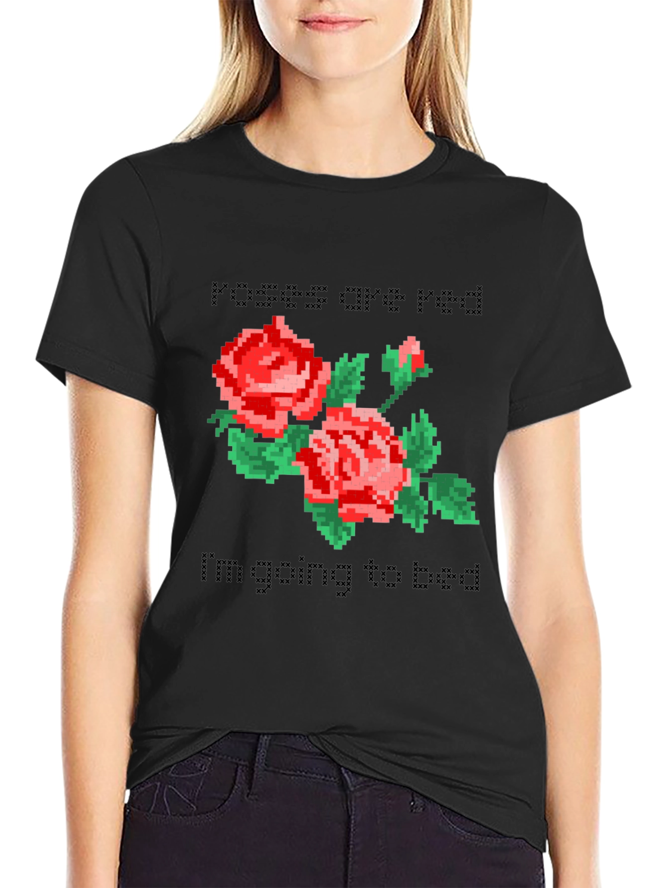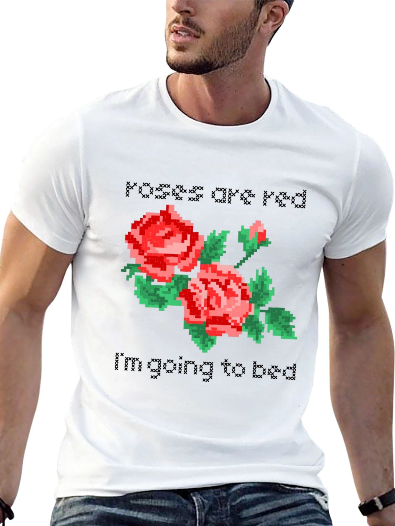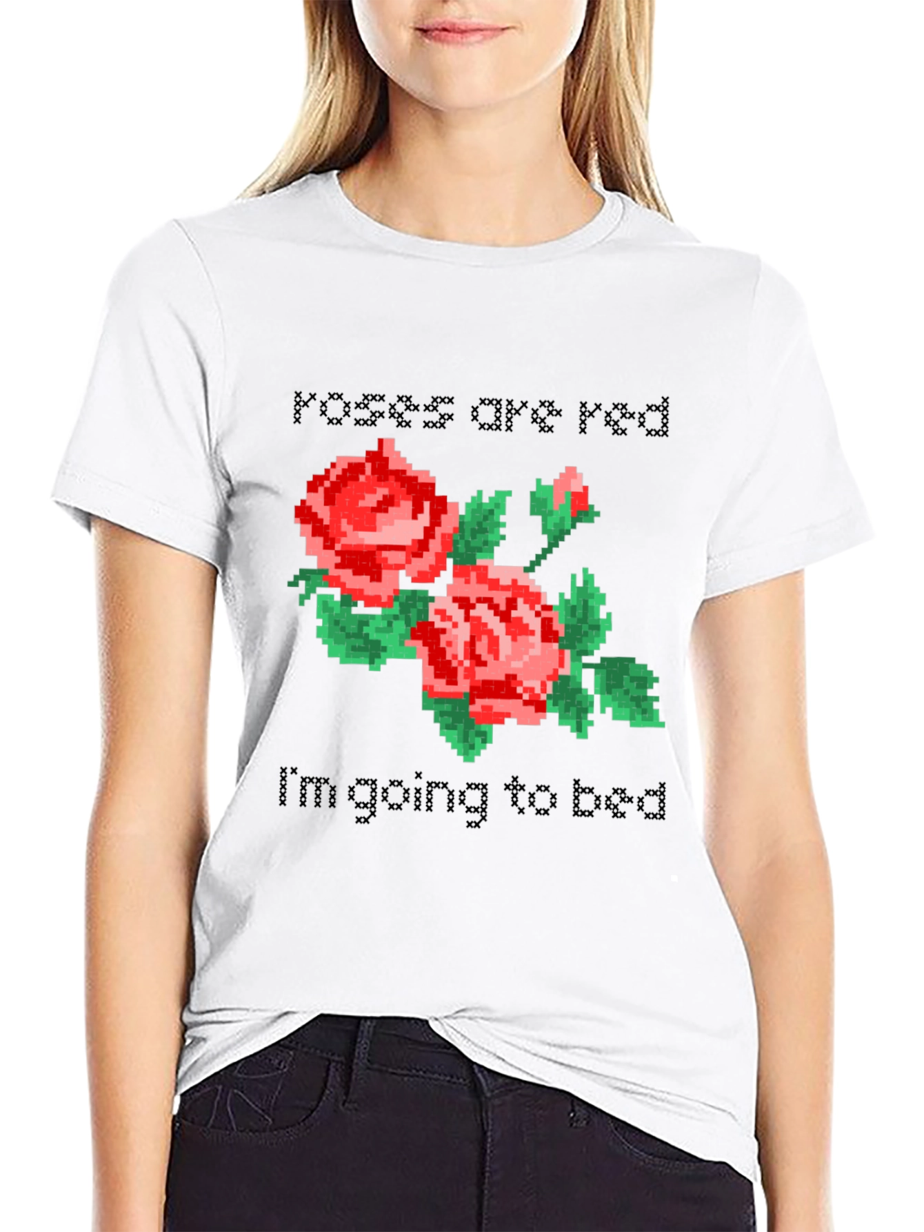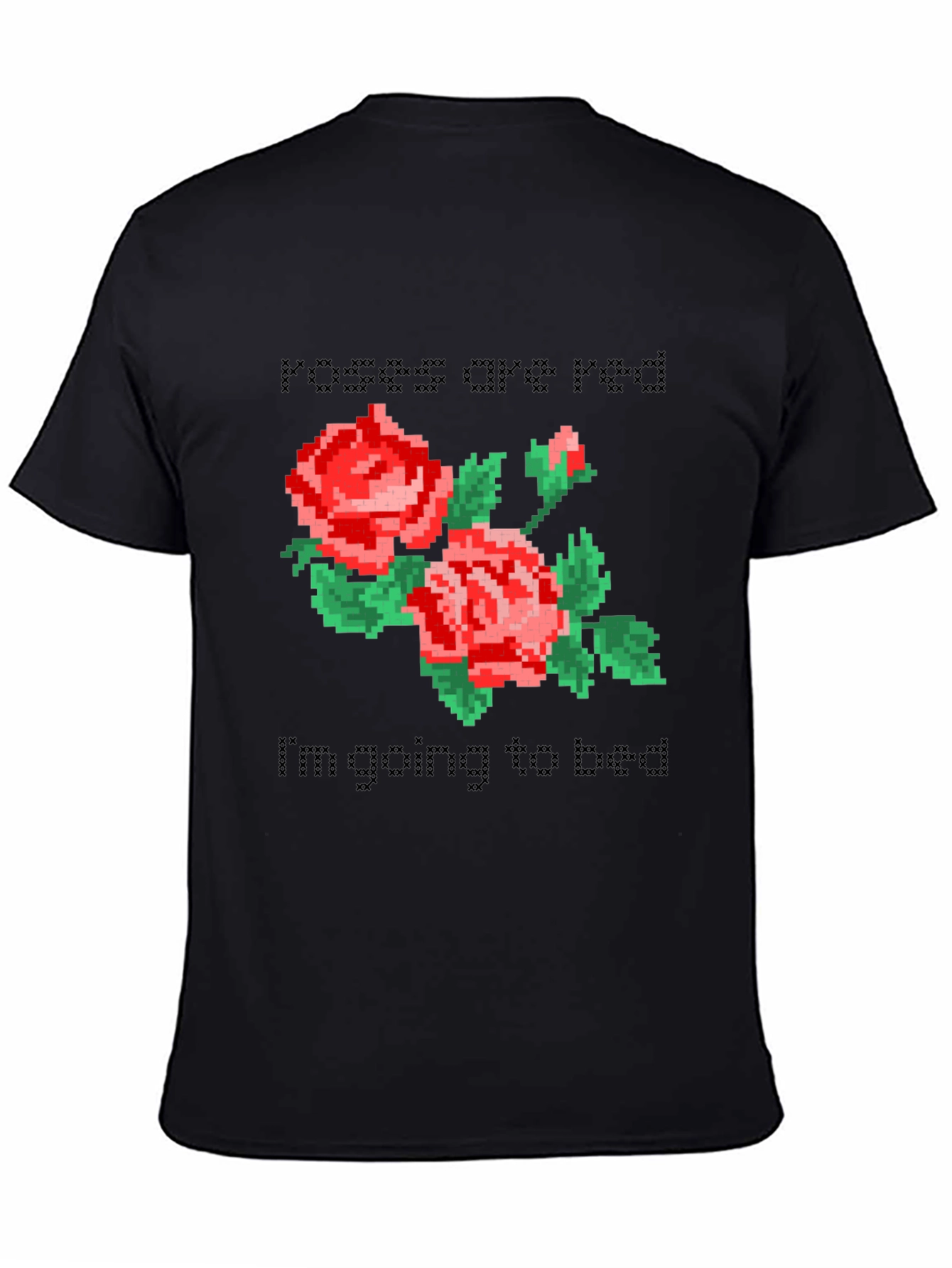 This unique black t-shirt features a pixelated design of roses and the phrase "roses are red i'm going to bed". The design gives off an 8-bit vintage feel. The shirt has a classic cut and looks great for a casual, relaxed outfit. The roses are vivid with a red hue. The message is sure to bring a smile to those who pass by! Made from a comfortable fabric blend, this tee is perfect for everyday wear or lounging around the house. It would also make a fun and thoughtful gift for anyone who loves roses, funny sayings, or just appreciates a good night's sleep!