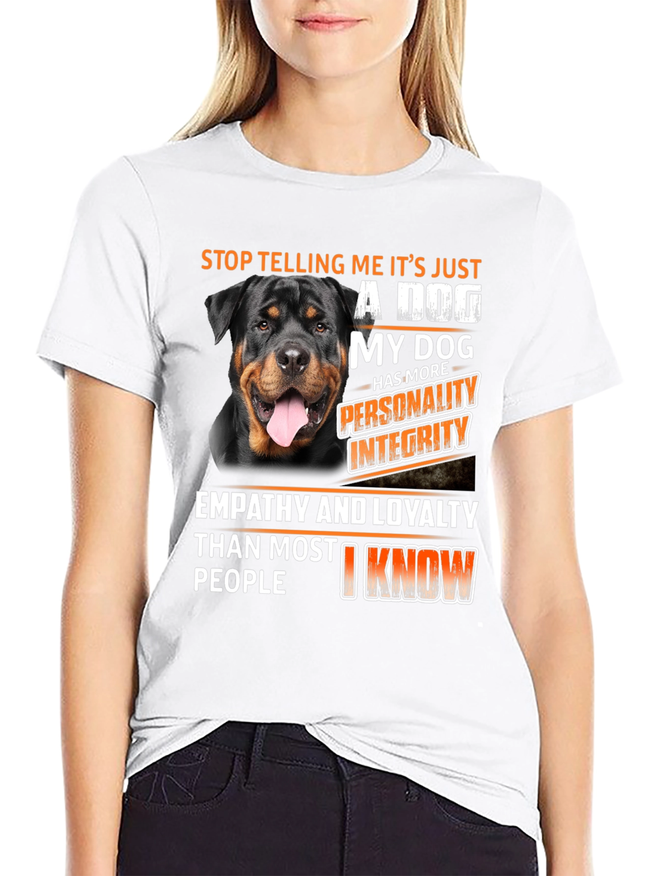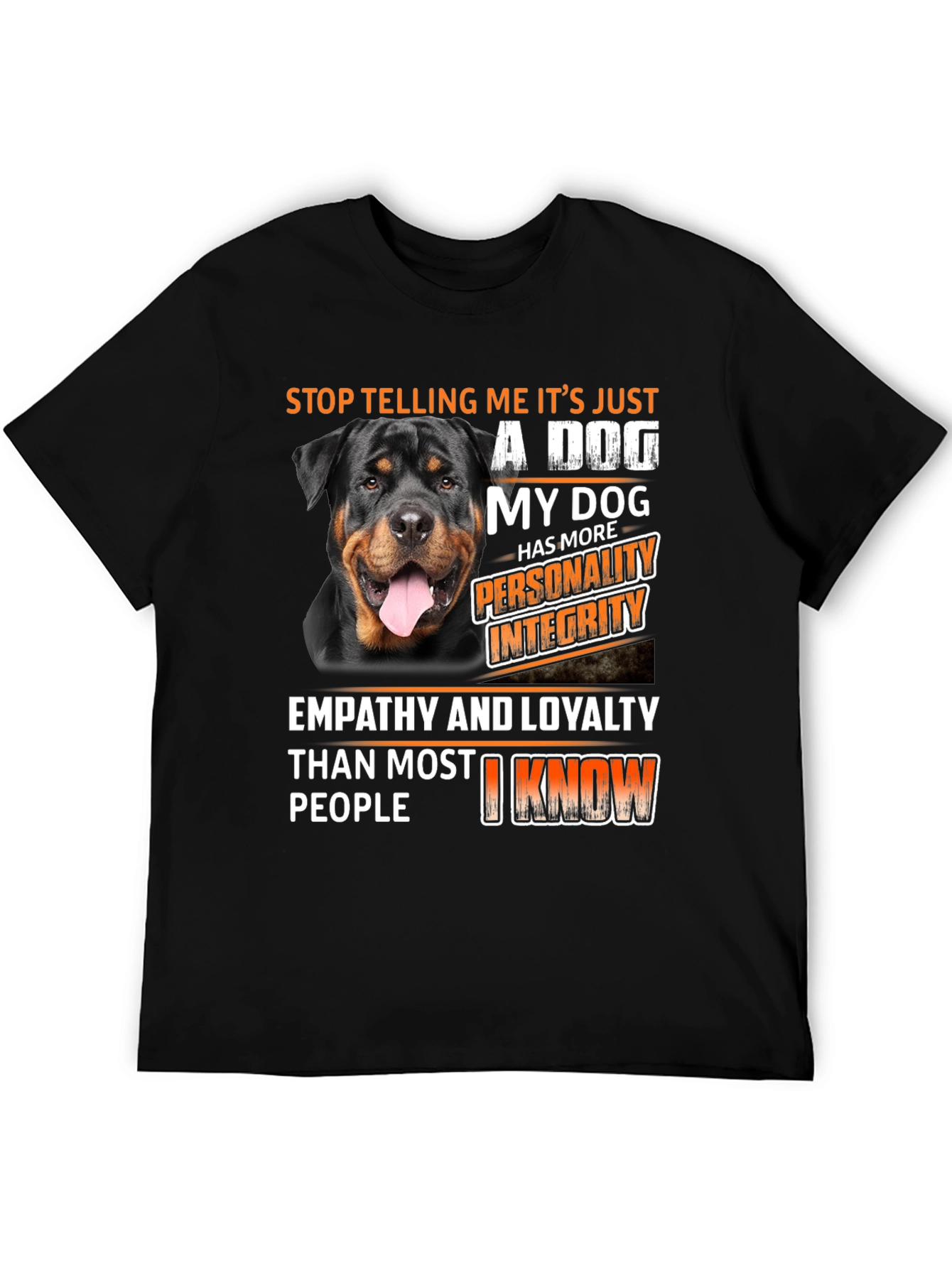 Show your love for Rottweilers with this unique t-shirt. The design features a beautiful Rottweiler and a bold statement: "Stop telling me it's just a dog. My dog has more personality, integrity, empathy and loyalty than most people I know." Made from comfortable black fabric, this shirt is perfect for casual wear. Its eye-catching design is sure to spark conversations and show off your affection for your furry friend. A must-have for any Rottweiler owner or dog lover!