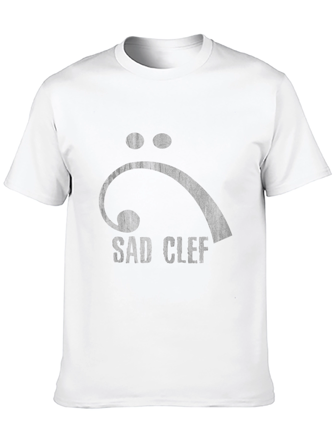 Express your love for music with this unique Sad Clef T-shirt. Featuring a distressed graphic of a bass clef resembling a sad face with the words "SAD CLEF" below, this tee is sure to turn heads. The black tee offers a classic, comfortable fit and is made from soft, breathable fabric. Perfect for musicians, music lovers, or anyone with a sense of humor! Whether you're practicing, attending a concert, or just lounging around, this graphic tee is a stylish way to showcase your passion for music and add a touch of personality to your wardrobe.