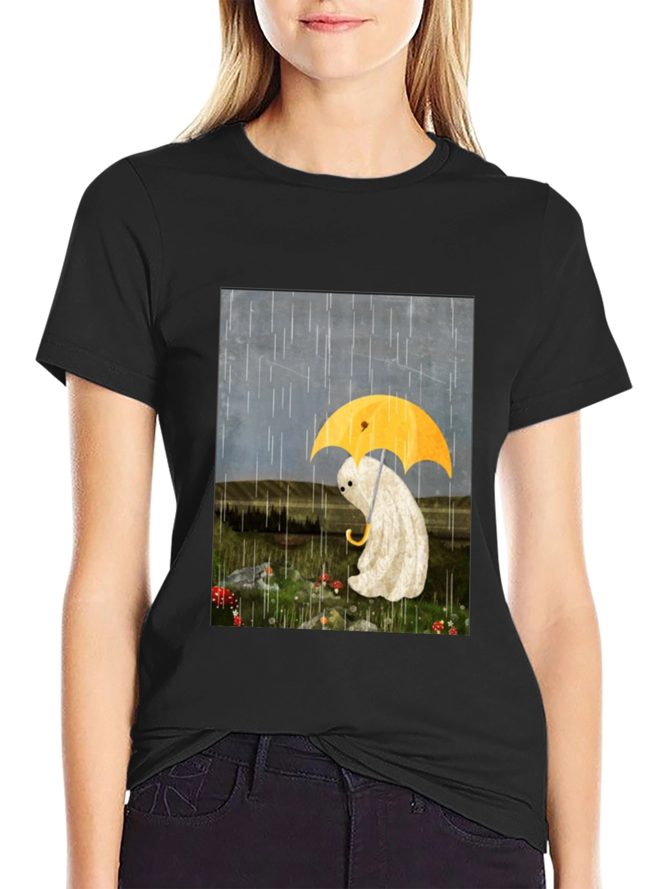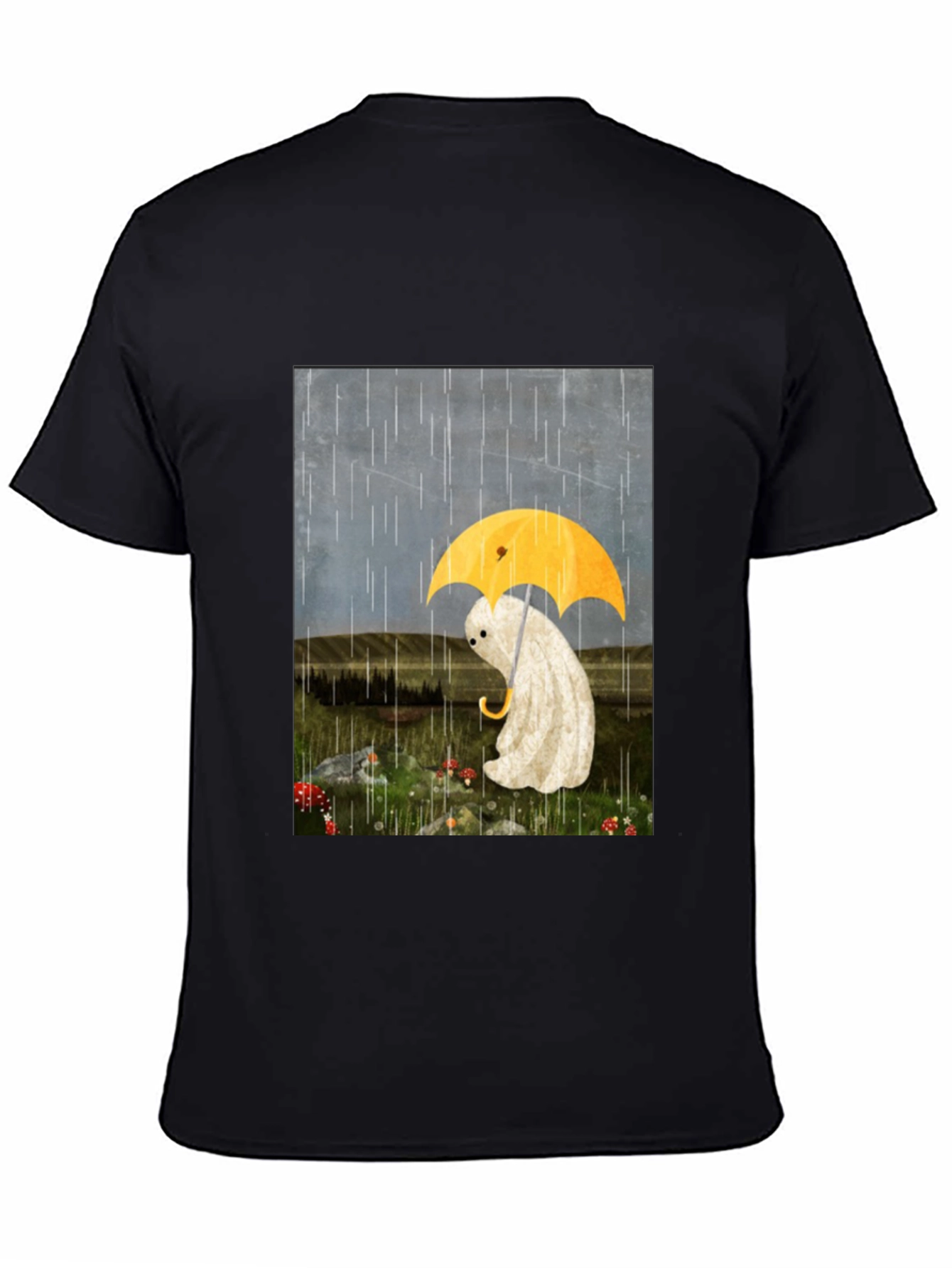This black t-shirt features a unique and whimsical graphic print. The design showcases a cute ghost holding a yellow umbrella in a rainy, outdoor scene. The artwork is set in a charming landscape filled with toadstools and lush greenery. Made from a comfortable, breathable fabric, this tee is perfect for everyday wear. It’s an ideal statement piece for those who love quirky, eye-catching apparel. Wear it to casual outings, social gatherings, or simply as a fun addition to your wardrobe. Show off your love for unique art with this comfortable and stylish t-shirt. Available in men's sizes.