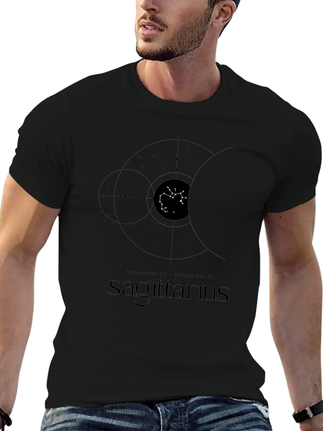 Show off your zodiac sign with this stylish black t-shirt. Featuring a minimalist Sagittarius constellation design encircled by geometric patterns, this shirt is perfect for astrology lovers. The shirt is made from a comfortable fabric, suitable for everyday wear. Whether you're looking to express your personality or simply want a unique graphic tee, this Sagittarius t-shirt is a great addition to your wardrobe. Makes a thoughtful gift for birthdays or any special occasion. Wear it casually with jeans or dress it up with a blazer for a night out. Its versatile style ensures it pairs well with any outfit.