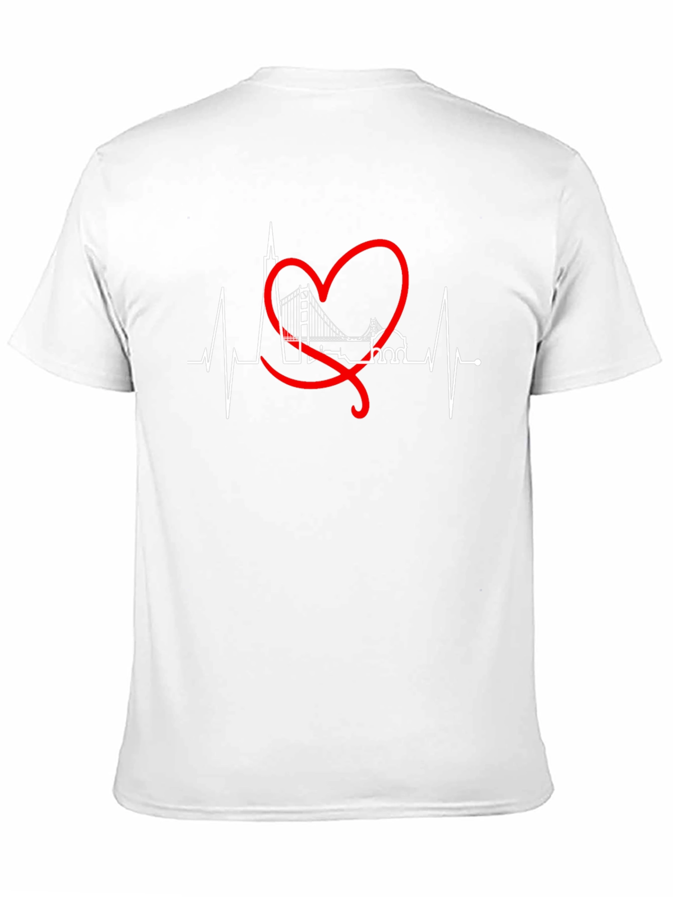 Show your love for San Francisco with this unique graphic T-shirt. The black tee features a stylized white heartbeat line that incorporates the city's iconic skyline, including the Golden Gate Bridge. A bold red heart overlay adds a touch of passion to the design. Made from what appears to be a soft and comfortable cotton blend, this short-sleeved shirt is perfect for everyday wear. Whether you're a San Francisco native, a frequent visitor, or simply an admirer of its beauty, this shirt is a stylish way to express your affection for the city by the bay. Perfect for casual outings or as a memorable souvenir.
