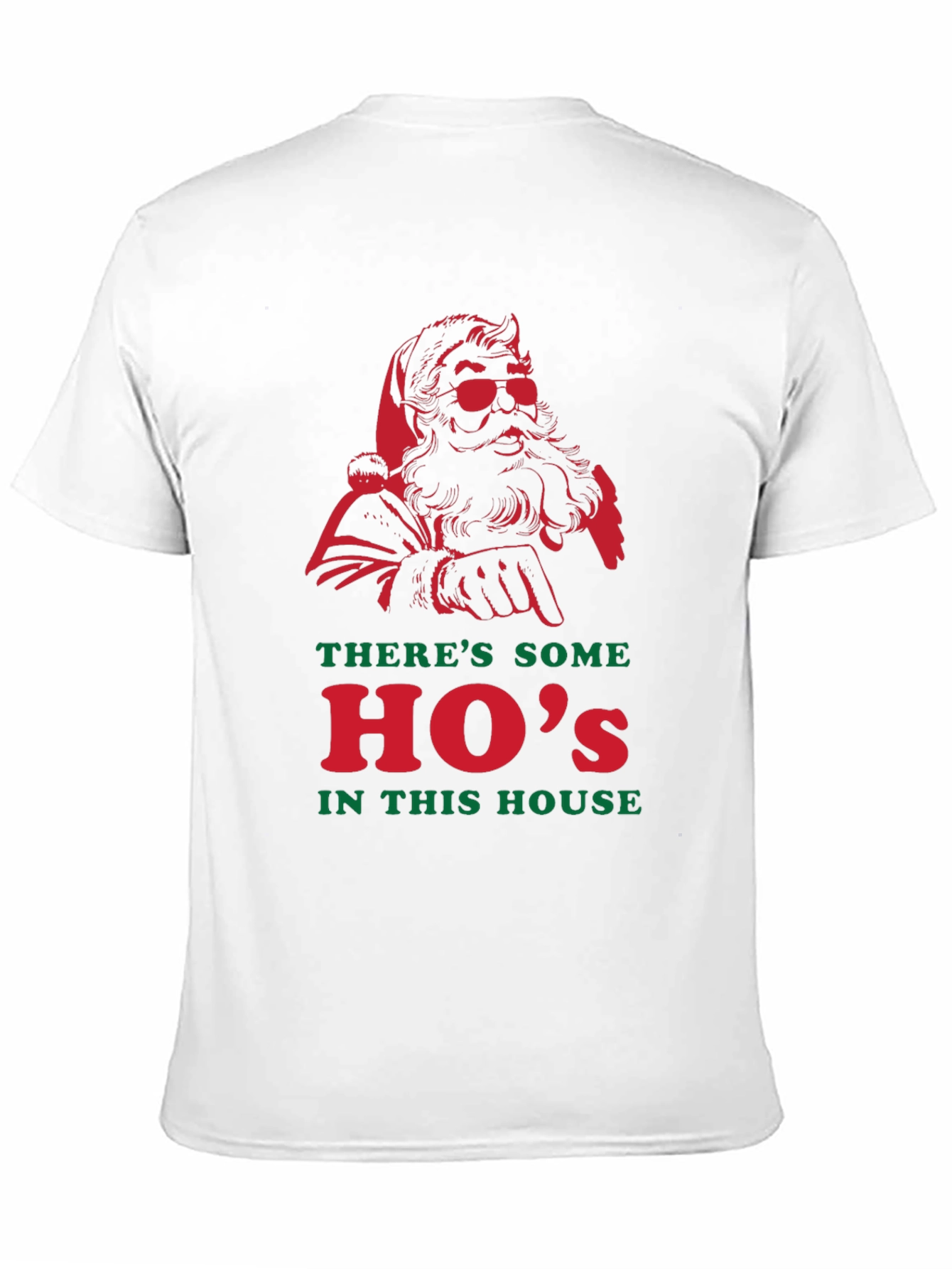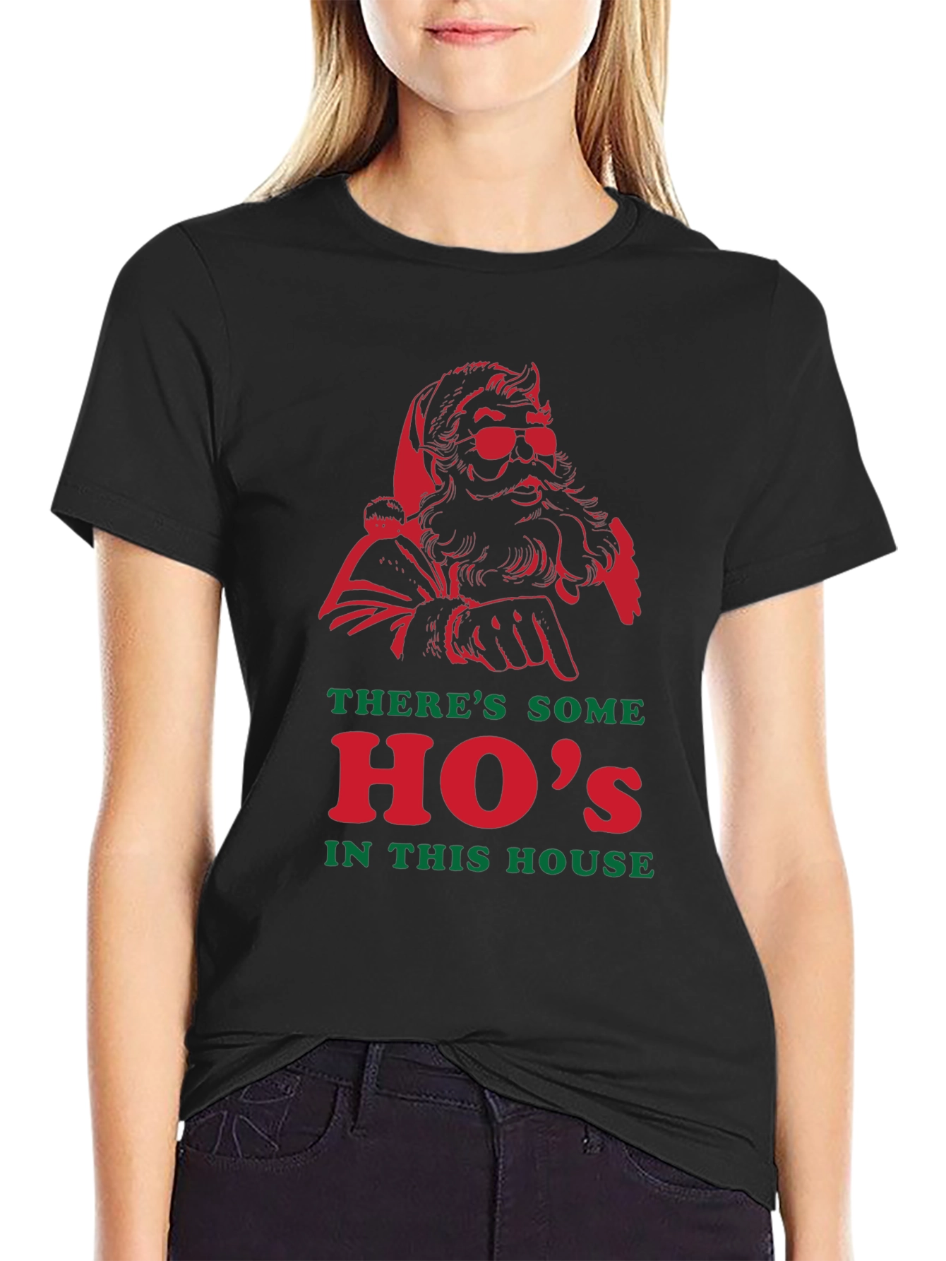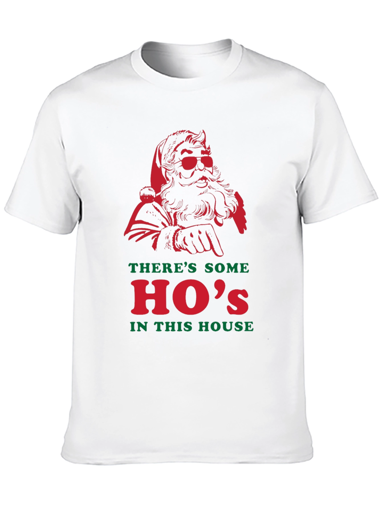 Show your holiday spirit with this bold black t-shirt. It features a Santa Claus graphic wearing sunglasses, accompanied by the humorous text "THERE'S SOME HO's IN THIS HOUSE" in festive red and green lettering. The shirt has a classic crew neck and short sleeves, making it comfortable for casual wear. Made from what appears to be a soft cotton blend, this tee is perfect for holiday parties, gatherings, or just spreading some cheeky cheer. Get ready to turn heads and start conversations with this eye-catching Christmas tee!