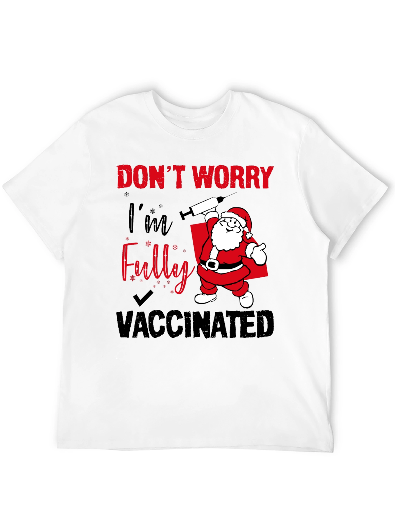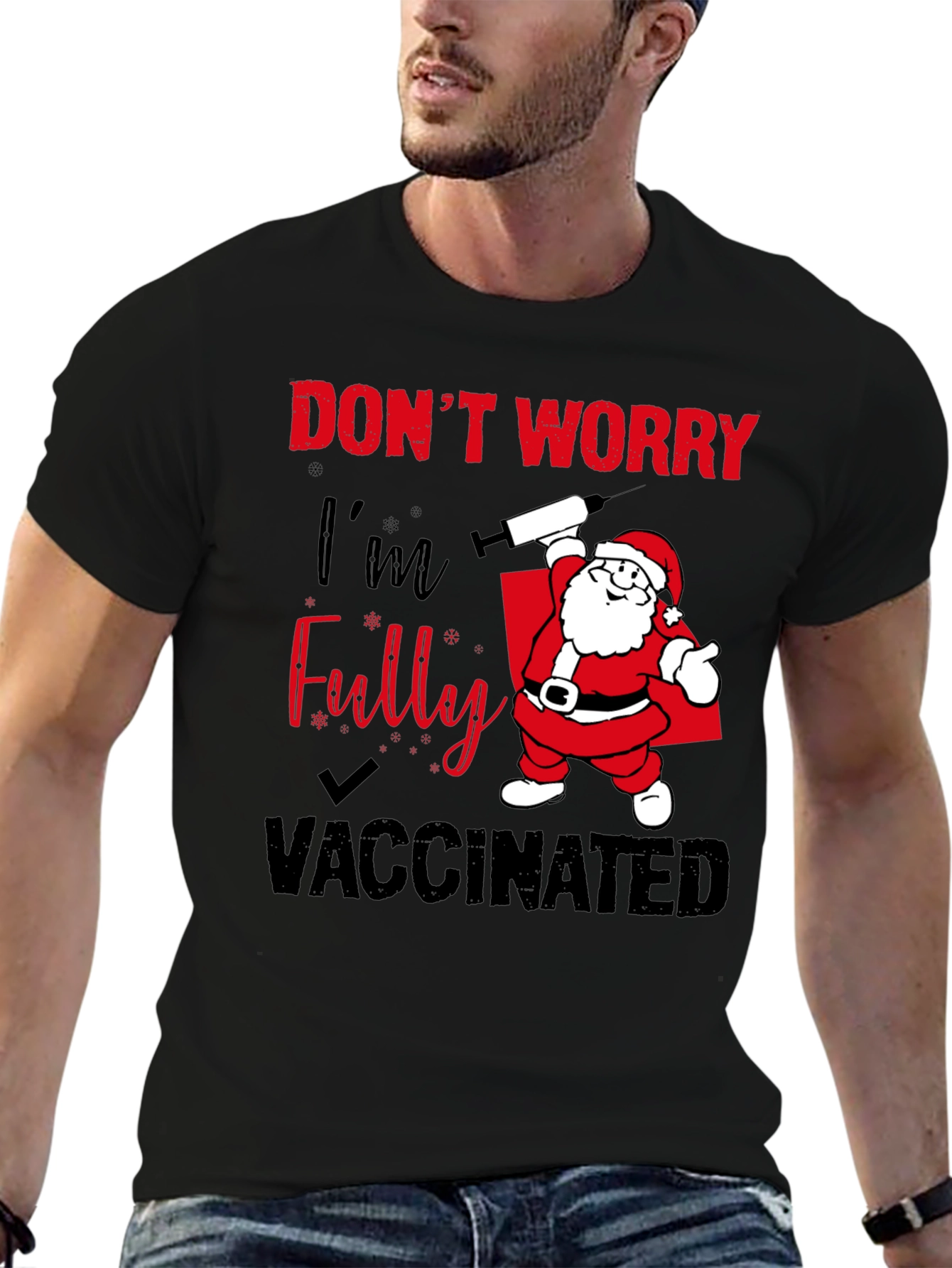 Show off your festive spirit while promoting health safety with this unique t-shirt. The design features a playful Santa Claus graphic holding a syringe, accompanied by the text 'Don't Worry I'm Fully Vaccinated'. Made from a soft, comfortable material, this tee is perfect for holiday gatherings, parties, or casual wear throughout the season. Its unique design sparks conversation and spreads a positive message. Stay stylish and responsible during the holidays with this eye-catching t-shirt!