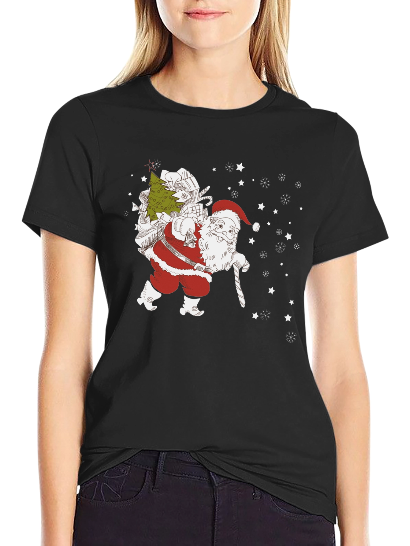 Spread holiday cheer with this unique black t-shirt featuring a jolly Santa Claus! The detailed graphic showcases Santa carrying a sack full of presents and a Christmas tree, all while surrounded by festive stars. Made from comfortable materials, this tee is perfect for casual wear during the holiday season. Show your festive spirit with this eye-catching Santa shirt!