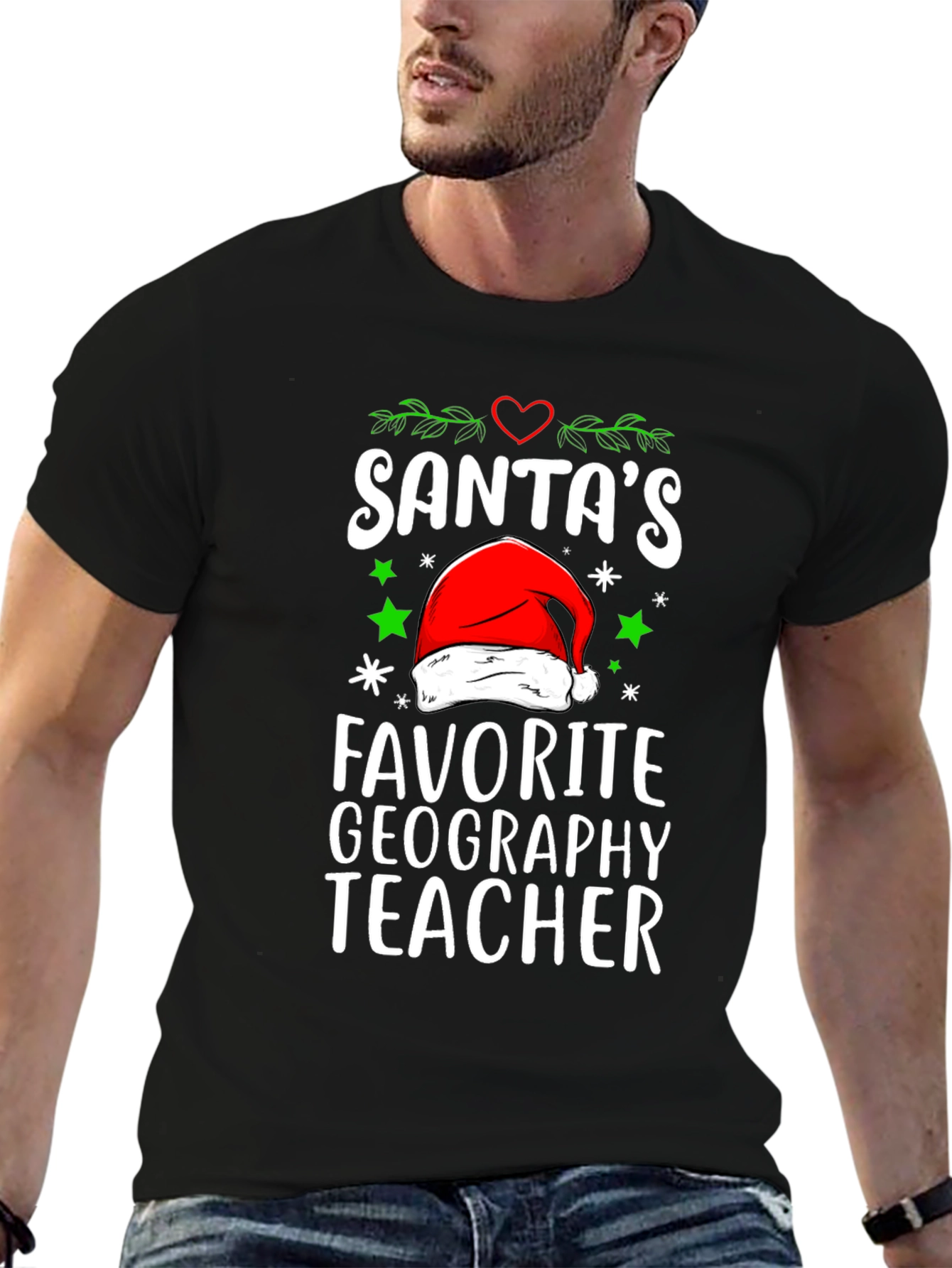 Show your love for geography this holiday season with this fun graphic t-shirt! The black tee features "Santa's Favorite Geography Teacher" printed in bold, white letters, decorated with a red Santa hat, green stars, and festive foliage. It's made from soft, comfortable fabric, ideal for everyday wear during the Christmas season. Perfect for teachers, geography enthusiasts, or anyone spreading holiday cheer. Grab yours now and celebrate your passion for geography with a touch of Santa's magic!