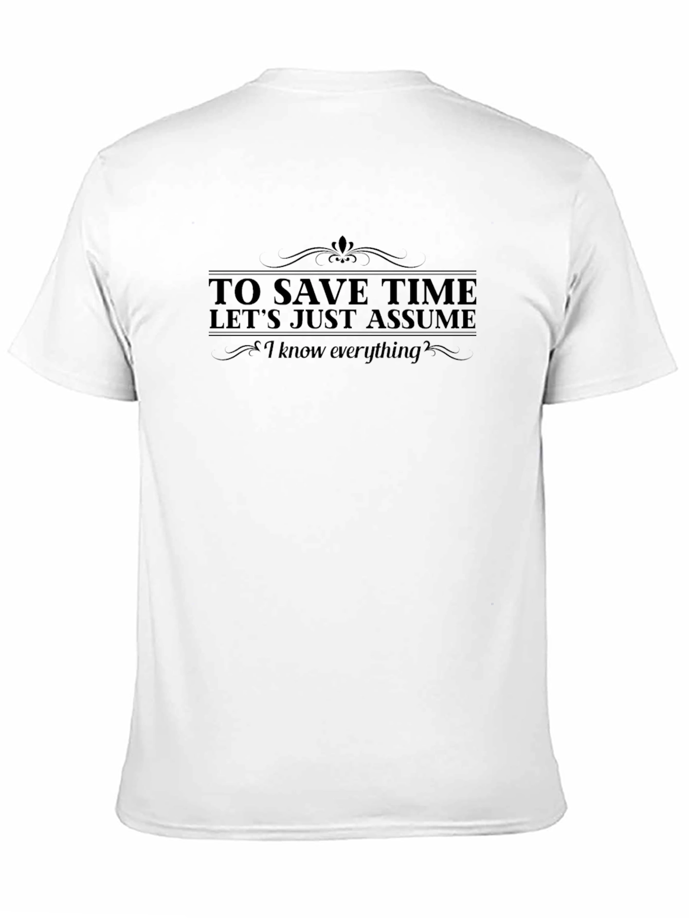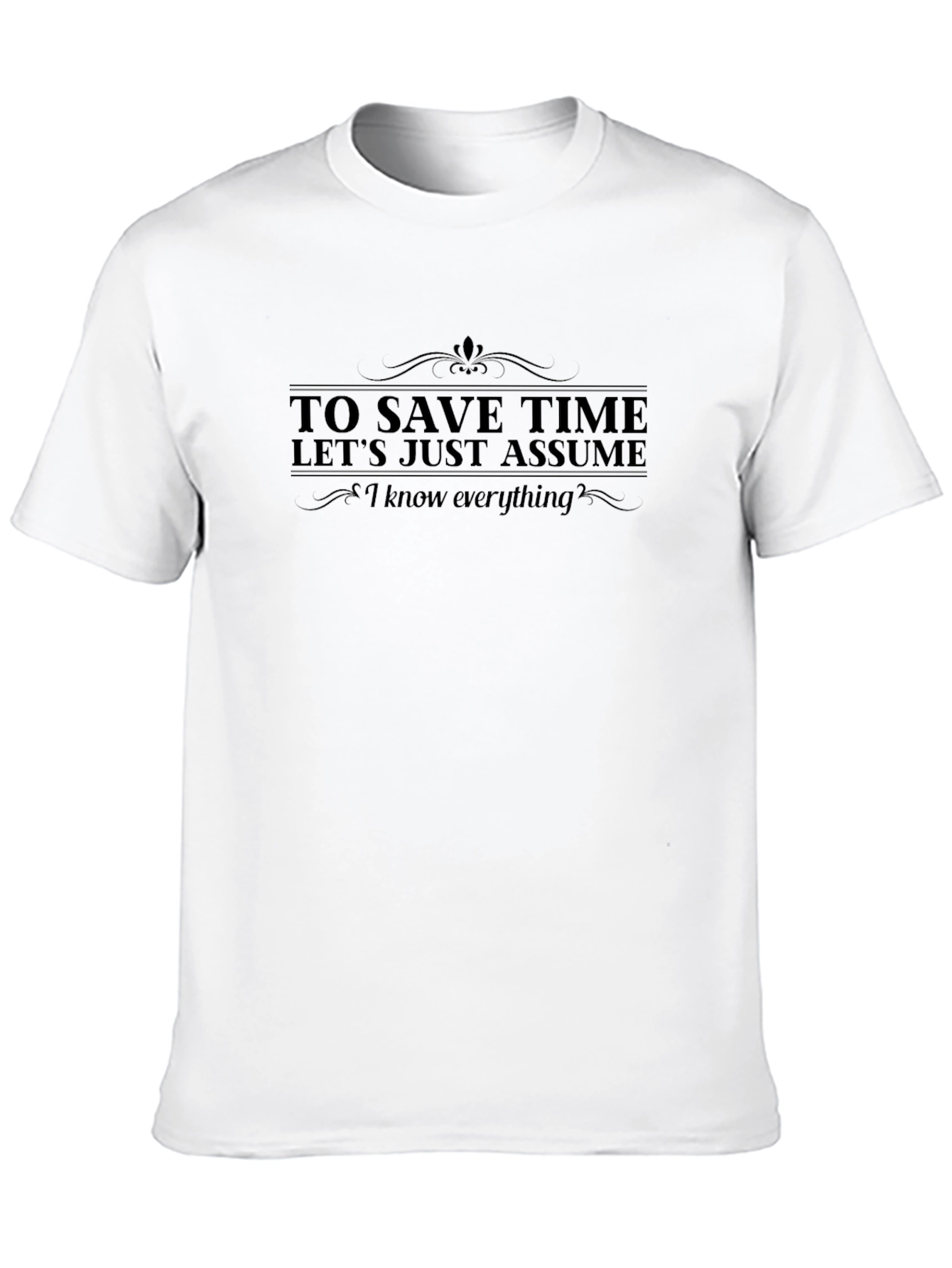 This black t-shirt features a humorous slogan: "To Save Time Let's Just Assume I Know Everything". The shirt is a classic crew neck style with short sleeves, made from what appears to be a soft, comfortable cotton blend. The dark print stands out subtly against the black fabric, giving it a sleek look. It's perfect for casual wear, parties, or as a quirky gift for the know-it-all in your life. Show off your sense of humor and make a statement with this unique t-shirt.