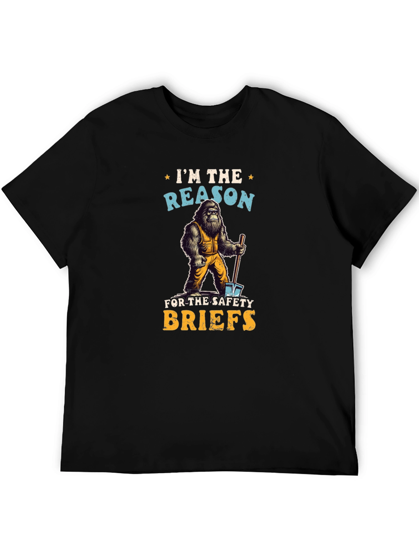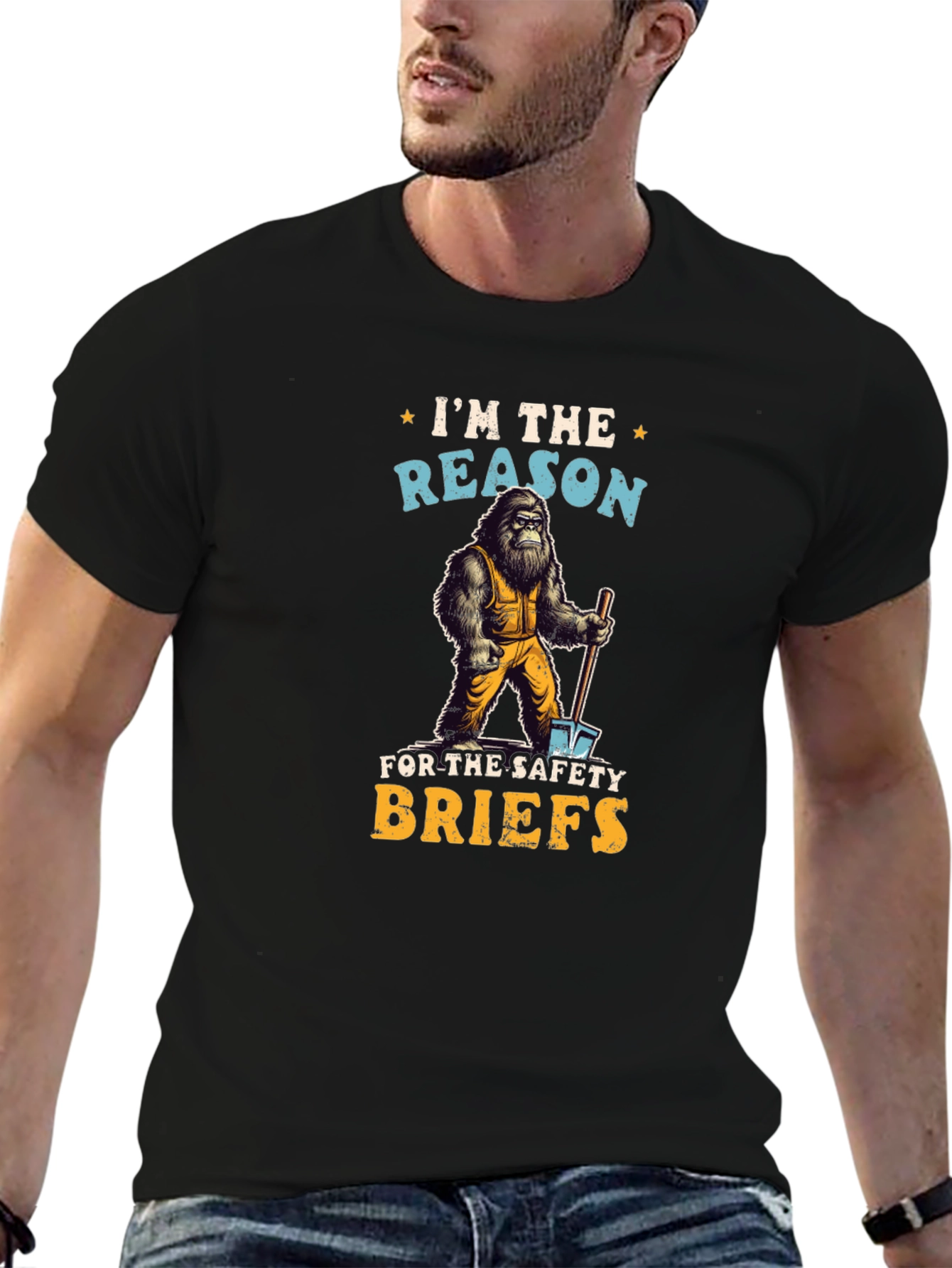 This striking black t-shirt features a humorous and eye-catching graphic. The design showcases a Bigfoot-like character holding a shovel, accompanied by the witty phrase "I'm the reason for the safety briefs." The text is rendered in distressed fonts of teal and gold, giving it a vintage feel. Made from what appears to be a soft and comfortable cotton blend, this tee is perfect for casual wear, sparking conversations, or showing off a playful side. The graphic is centered on the chest, making it a focal point. A great gift for those with a sense of humor or fans of cryptids!