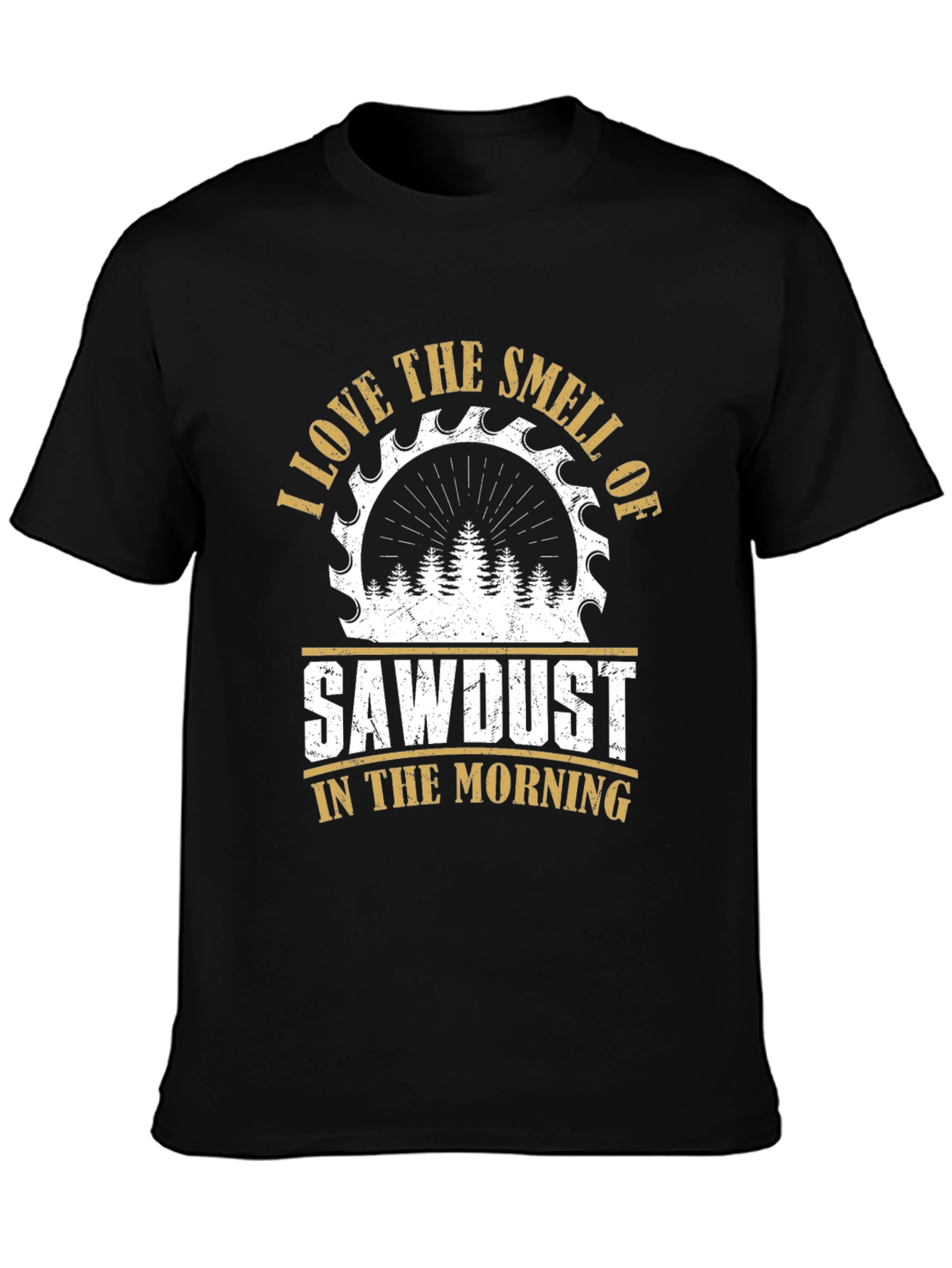 This black t-shirt features a creative graphic design for woodworking enthusiasts. The design incorporates a saw blade image with a forest silhouette. "I LOVE THE SMELL OF SAWDUST IN THE MORNING" is printed in a distressed style, giving it a vintage look. Made from a comfortable fabric, this shirt is perfect for casual wear or as a gift for any carpenter, woodworker, or DIY enthusiast. Show off your love for woodworking with this unique and stylish tee. Great for wearing in the workshop or out and about.
