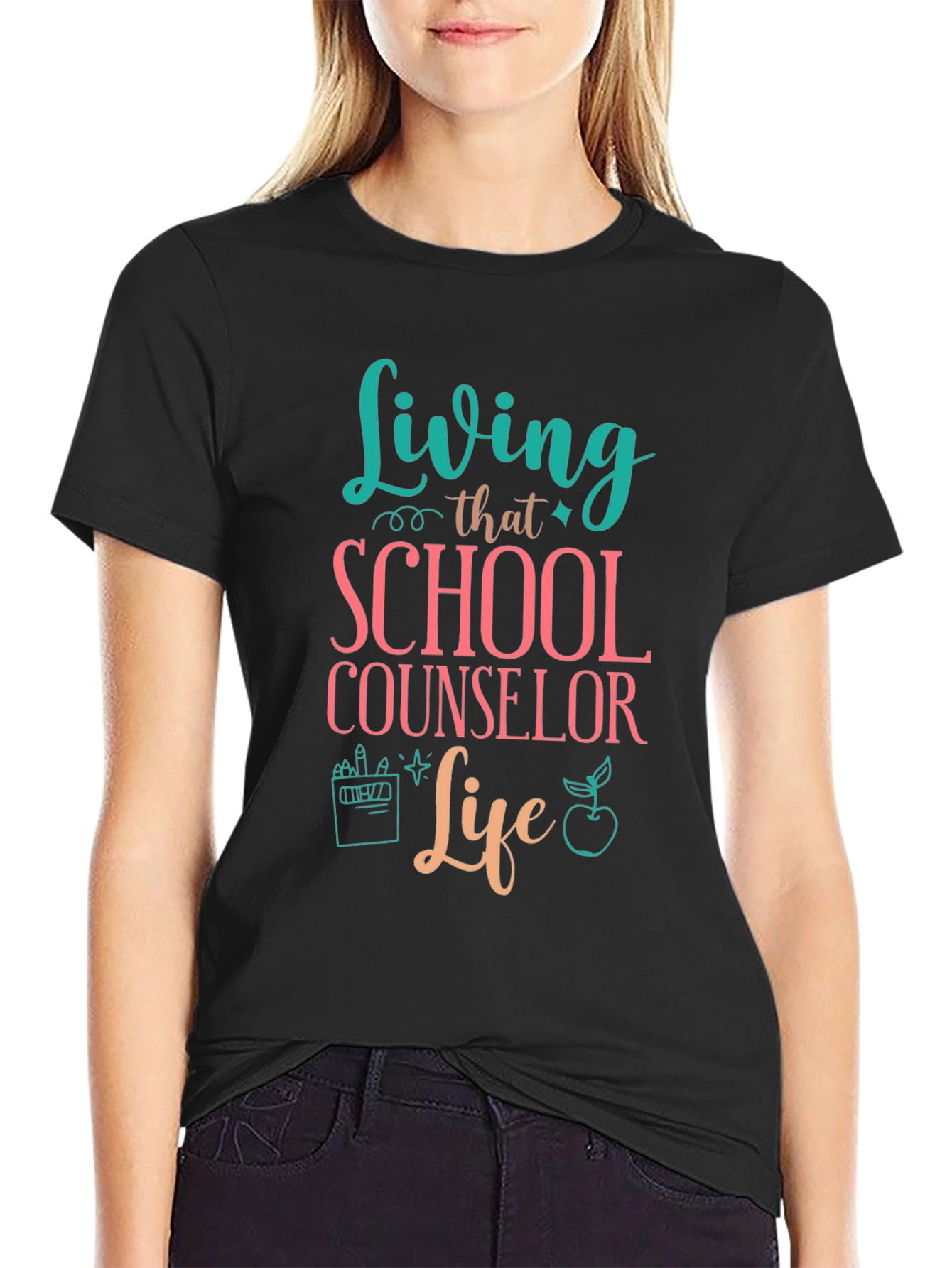 Show your appreciation for school counselors with this stylish black t-shirt. The design features fun, colorful lettering that reads "Living that SCHOOL COUNSELOR Life," accompanied by cute school-themed graphics, including an apple and art supplies. Made from a soft, comfortable fabric, this tee is perfect for casual wear at school, work, or during downtime. It's a great conversation starter and a thoughtful gift for the dedicated counselor in your life. Express your passion and dedication with this awesome t-shirt!