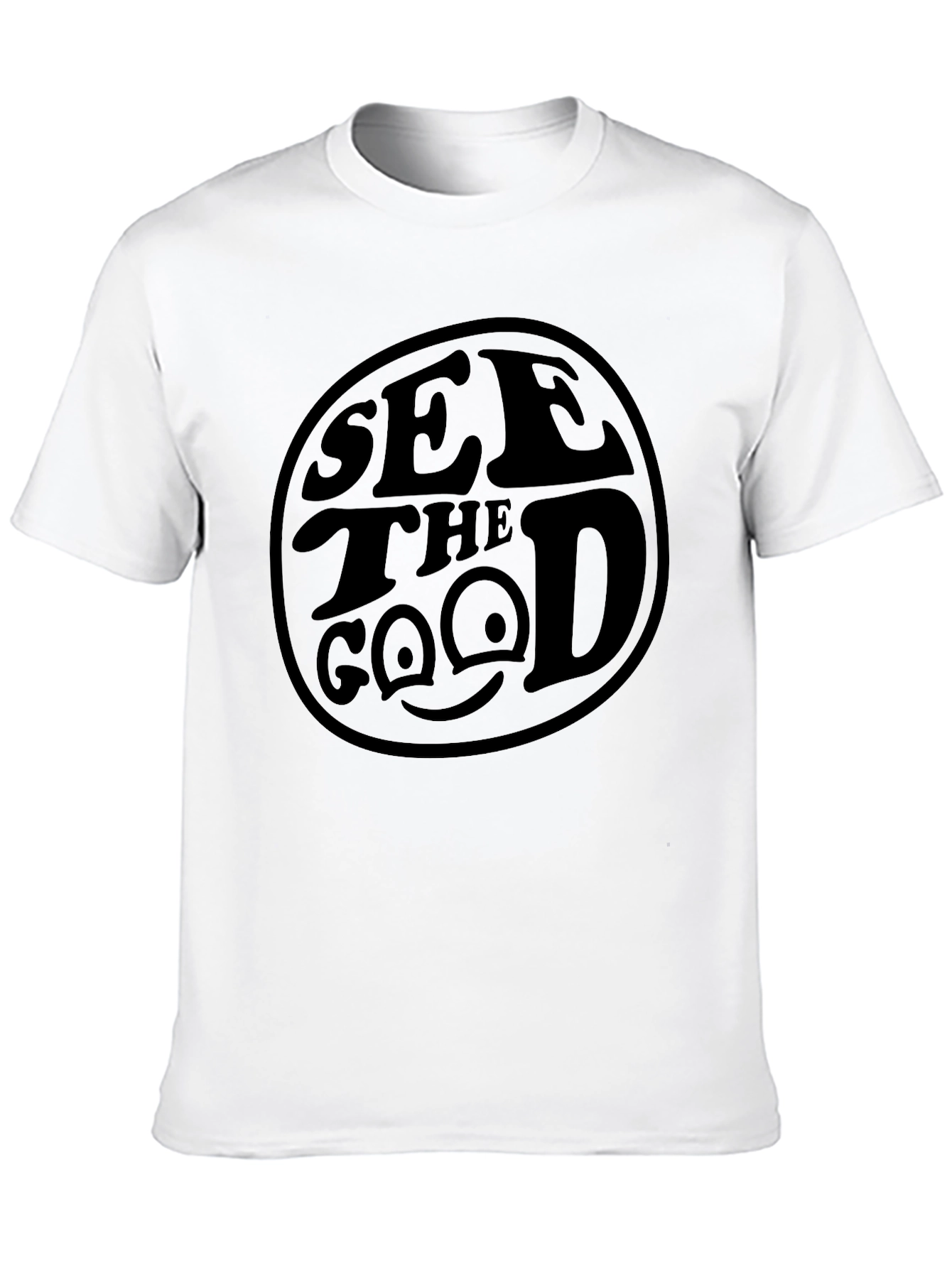 This classic black t-shirt features a bold, circular graphic design with the uplifting message "See the Good." The text is stylized in a retro, bubble-letter font, creating a playful and eye-catching look. Made from what appears to be a soft and comfortable cotton blend, this tee is perfect for everyday wear. The design incorporates a subtle smiley face element into the word "Good", adding a touch of lightheartedness. Whether you're running errands, hanging out with friends, or simply relaxing at home, this shirt is a great way to spread positivity and good vibes. Its simple design makes it versatile, pairing well with jeans, shorts, or casual pants. Embrace the message and rock this stylish, feel-good tee!