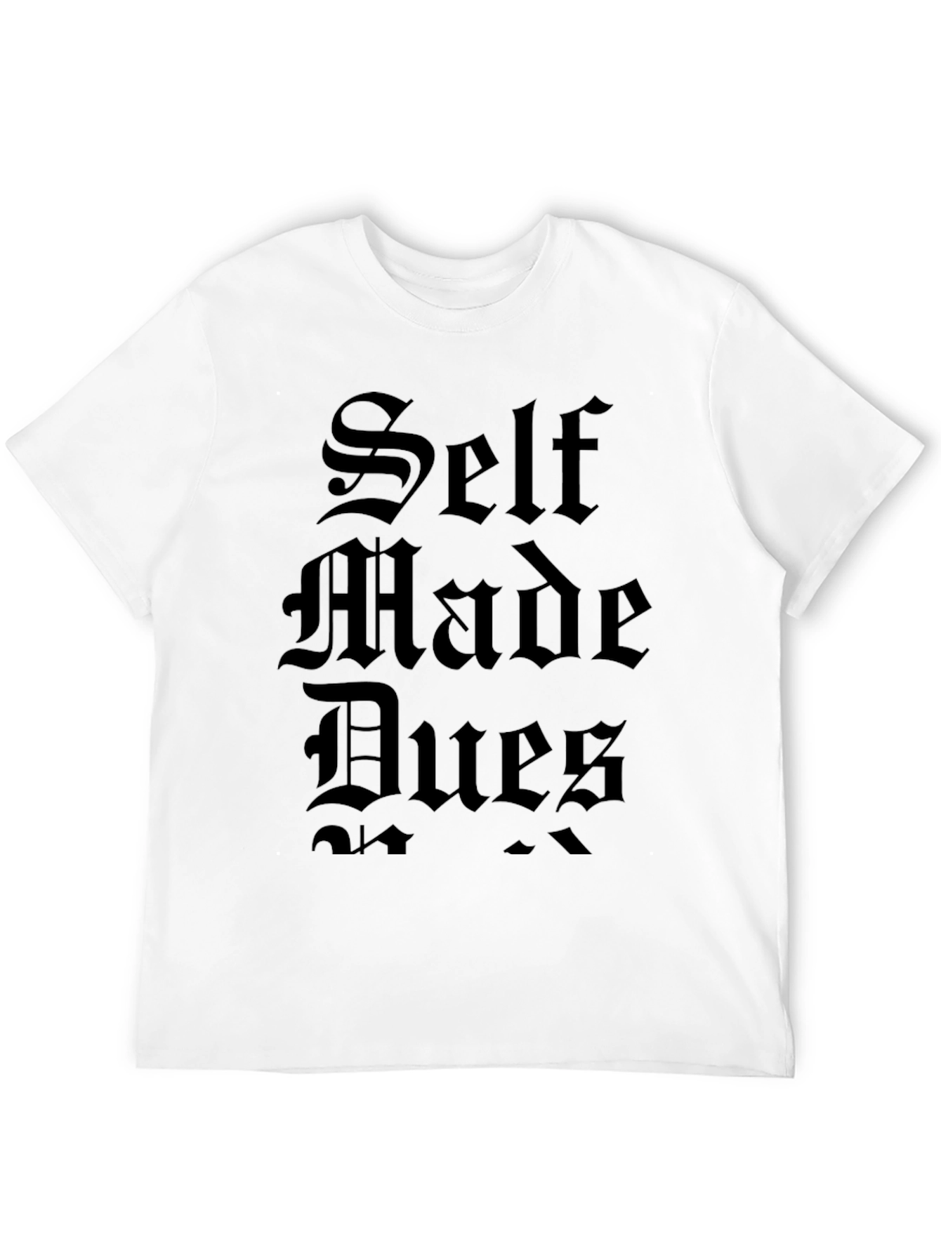 Showcase your self-made spirit with this bold black tee! Featuring a striking "Self Made Dues" gothic-style print across the chest, this shirt makes a statement. The classic cut and soft fabric provide all-day comfort, while the dark color adds a touch of edgy style. Perfect for casual wear, concerts, or making a statement. Pair it with jeans or shorts for a complete look. Be you and wear it proud!