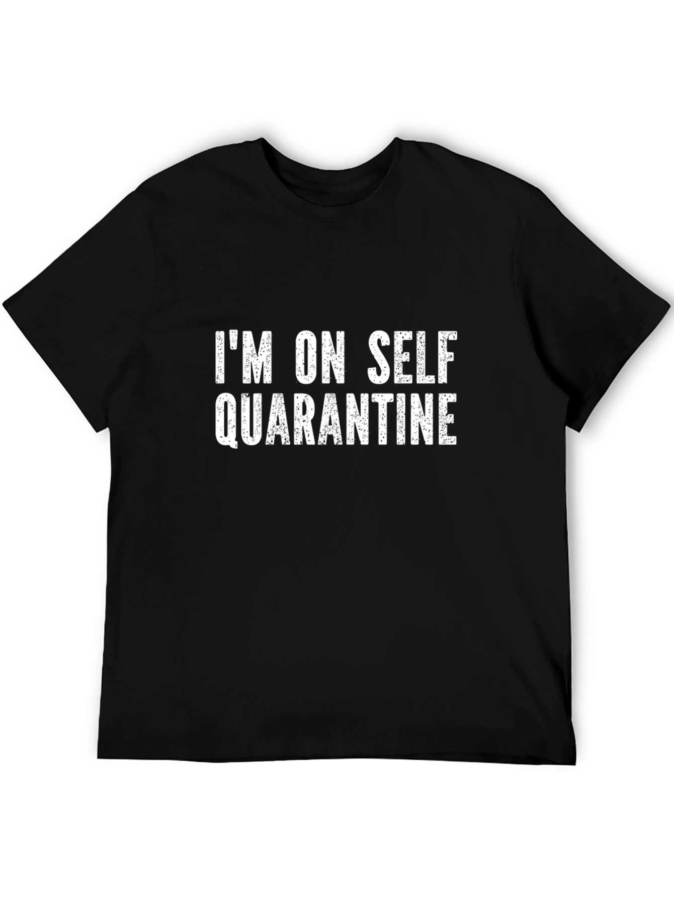 Declare your social distance with this black tee featuring a bold white print that reads "I'M ON SELF QUARANTINE." Made from what appears to be a soft, breathable cotton or cotton blend, this shirt offers both comfort and a clear message. The classic crew neck and short sleeves provide a relaxed fit, suitable for lounging at home or running essential errands. Show the world you're doing your part while staying stylish and comfortable. Perfect for making a statement during these times. A must-have addition to any wardrobe.