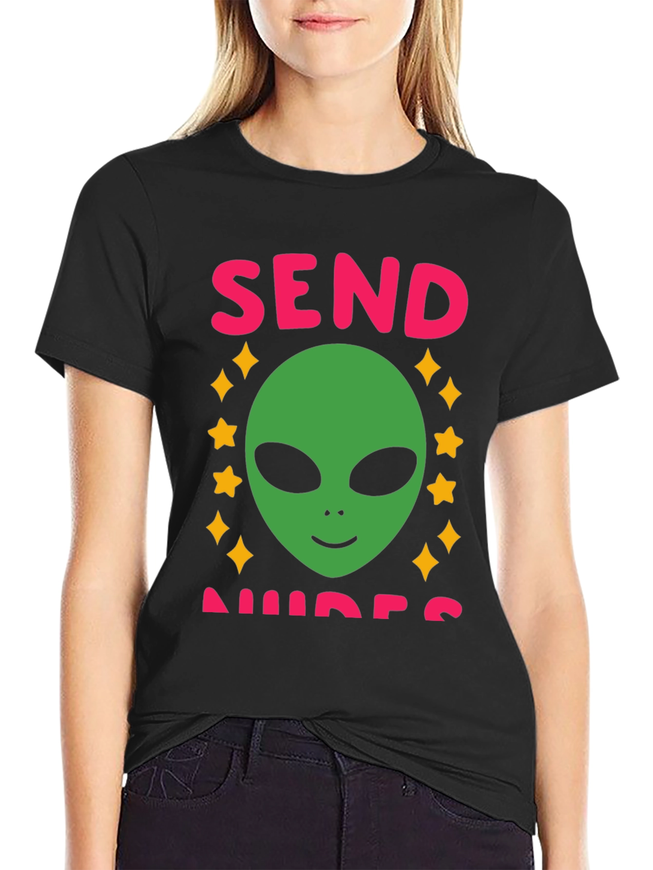 This eye-catching black t-shirt features a humorous design with a playful message. The bold pink "SEND" and "NUDES" text sandwich a cartoonish green alien head, complete with large black eyes and a subtle smile. The alien is surrounded by a sparkling array of yellow stars, adding a touch of whimsical charm. Made from a soft and comfortable material, this t-shirt is perfect for casual wear, parties, or making a statement. It's sure to grab attention and spark conversations wherever you go. Ideal for those who love quirky, lighthearted fashion.