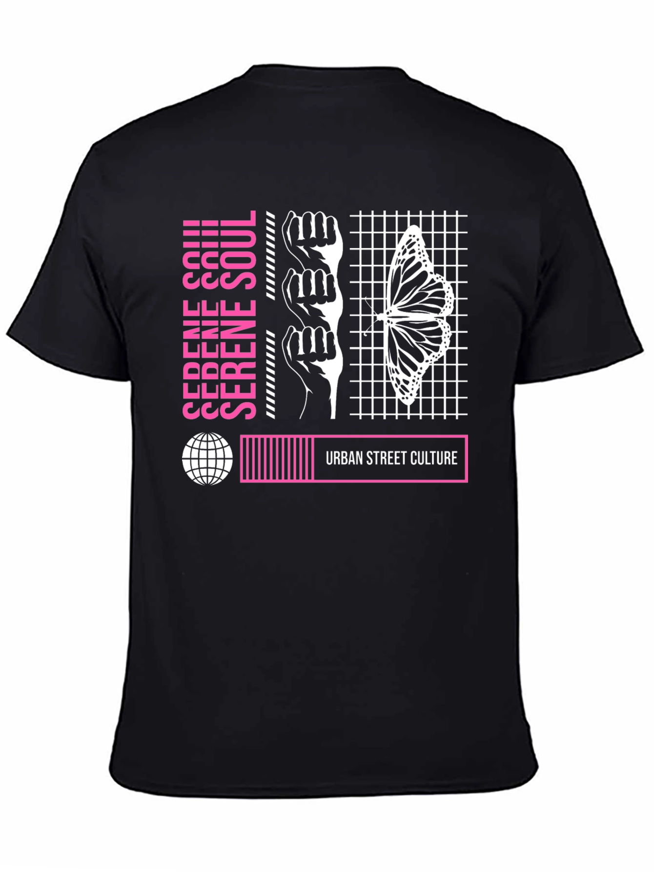 Elevate your streetwear style with this bold and unique graphic tee. Crafted from soft, breathable fabric, this black t-shirt features an eye-catching design with "SERENE SOUL" text, empowering fist symbols, and a delicate butterfly against a grid backdrop. The design incorporates a globe graphic and "URBAN STREET CULTURE" text, finished with pink stripes. Perfect for expressing your individuality and making a statement. Pair it with jeans or joggers for a casual yet trendy look.