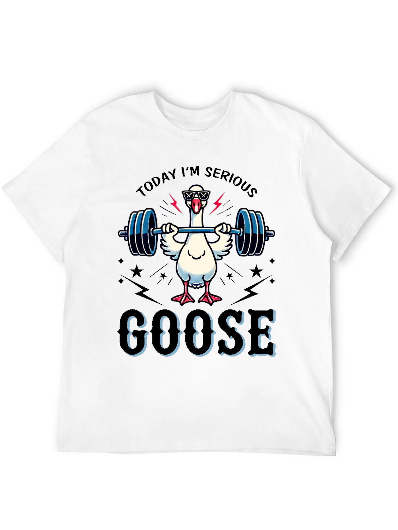 This black t-shirt features a unique and humorous design of a goose lifting a barbell. The goose is wearing sunglasses, giving it a serious demeanor, complemented by the text 'TODAY I'M SERIOUS' above the design. Below the goose is the word 'GOOSE' in a slightly distressed, block letter font with a blue outline. The graphic includes details like lightning bolts and stars, adding a dynamic feel. Made from what appears to be comfortable material, this shirt is perfect for workout enthusiasts, animal lovers, or anyone who enjoys quirky, eye-catching apparel. Show off your fun side with this goose-themed t-shirt!