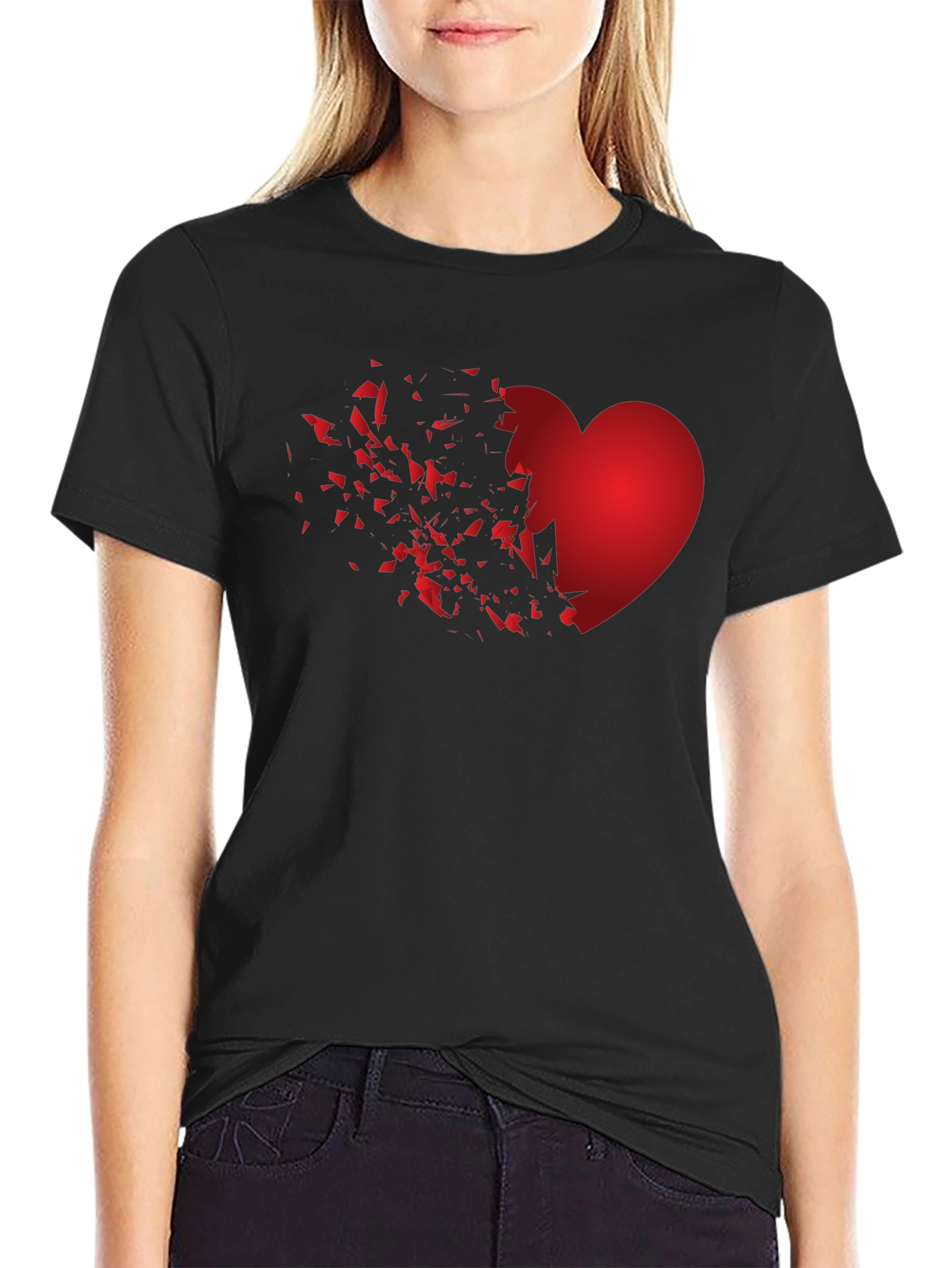 Show off your unique style with this bold black t-shirt. The design features a striking red heart graphic that appears to be shattering into pieces. The vibrant color and dynamic design is sure to make a statement. Crafted from comfortable fabric, this tee offers both style and comfort for everyday wear. Perfect for expressing your individuality. Ideal for casual outings, concerts, or as a standout piece in your wardrobe.