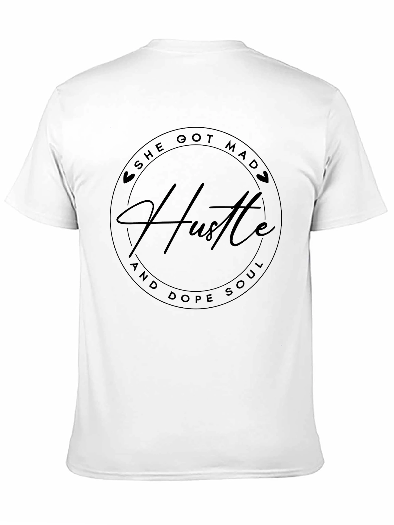 Show off your determination with this stylish black graphic t-shirt. This tee features a circular design with the phrase 'She Got Mad Hustle and Dope Soul', perfect for adding a touch of inspiration to your everyday look. Made from comfortable material, this shirt is soft, breathable, and ideal for casual wear. Whether you're hitting the gym, running errands, or just hanging out with friends, this versatile tee will keep you feeling confident and motivated. The design is a statement, making it a great conversation starter and a unique addition to your wardrobe. Pair with jeans, shorts, or a skirt for an effortlessly cool style.