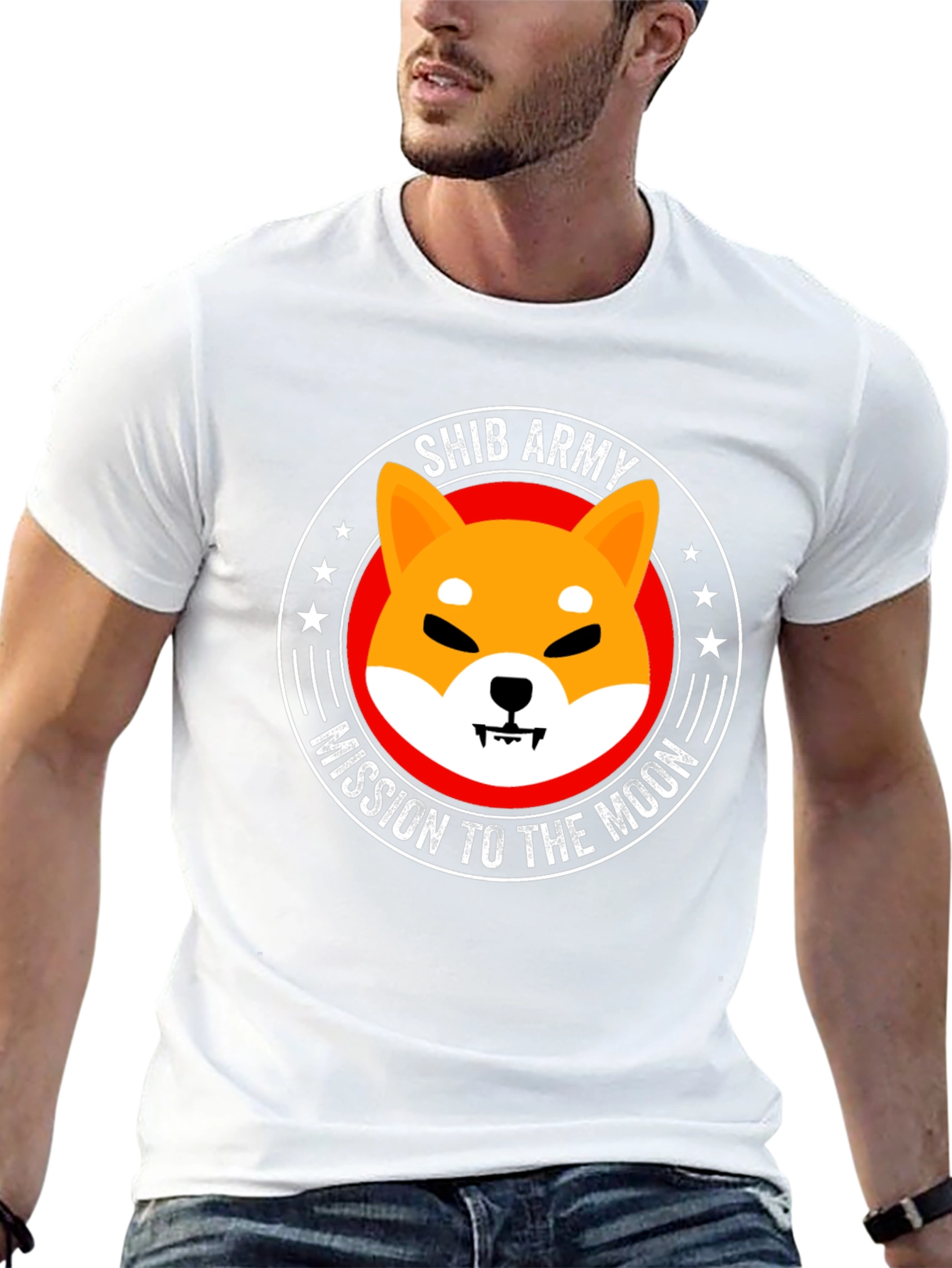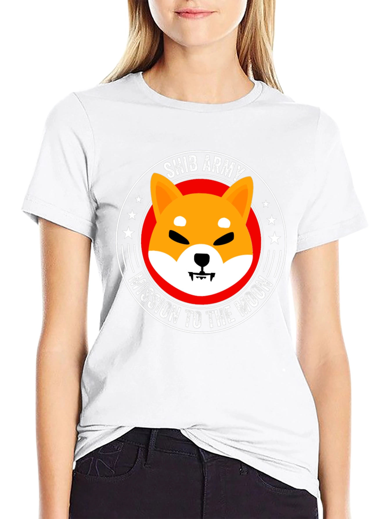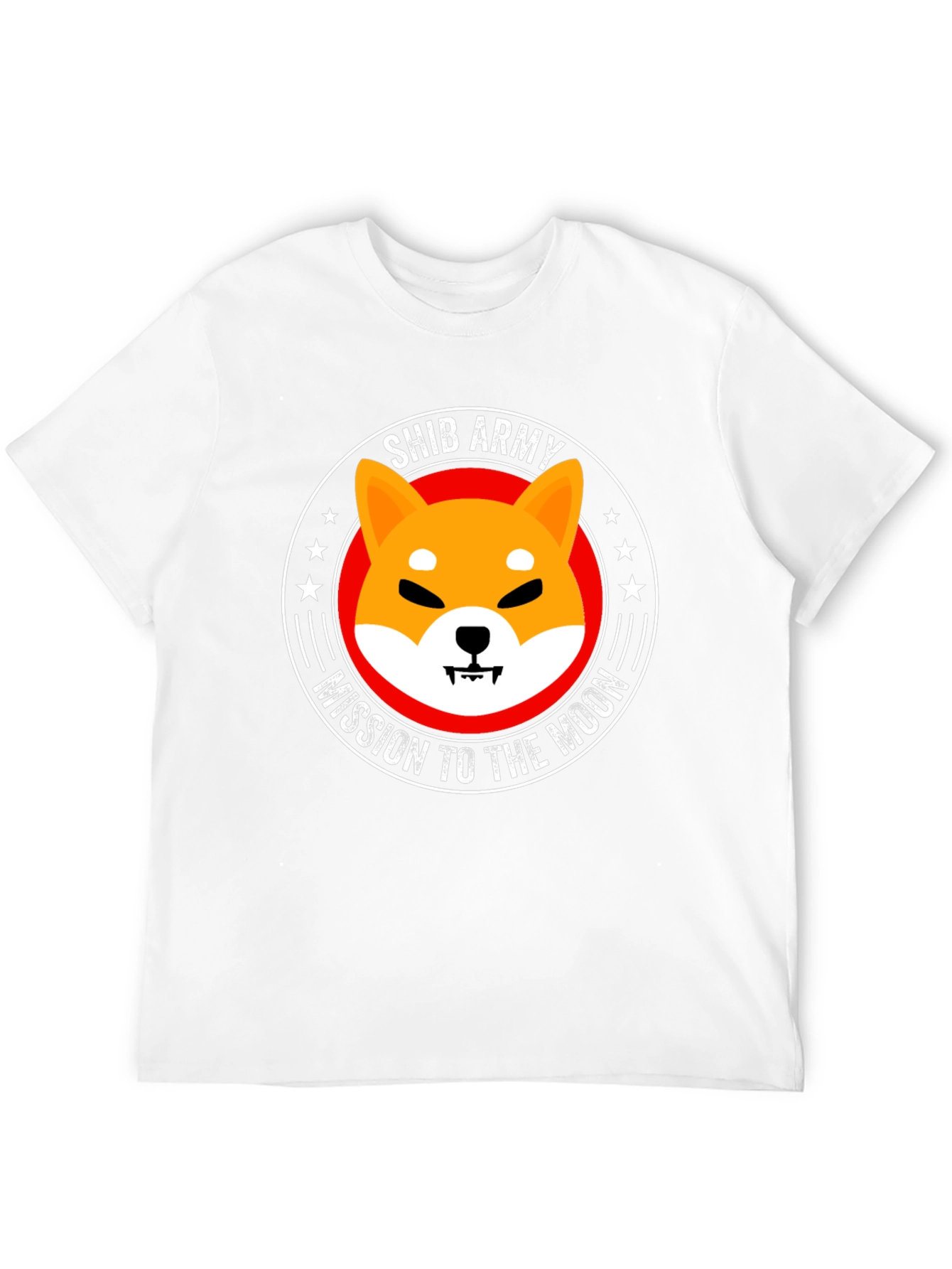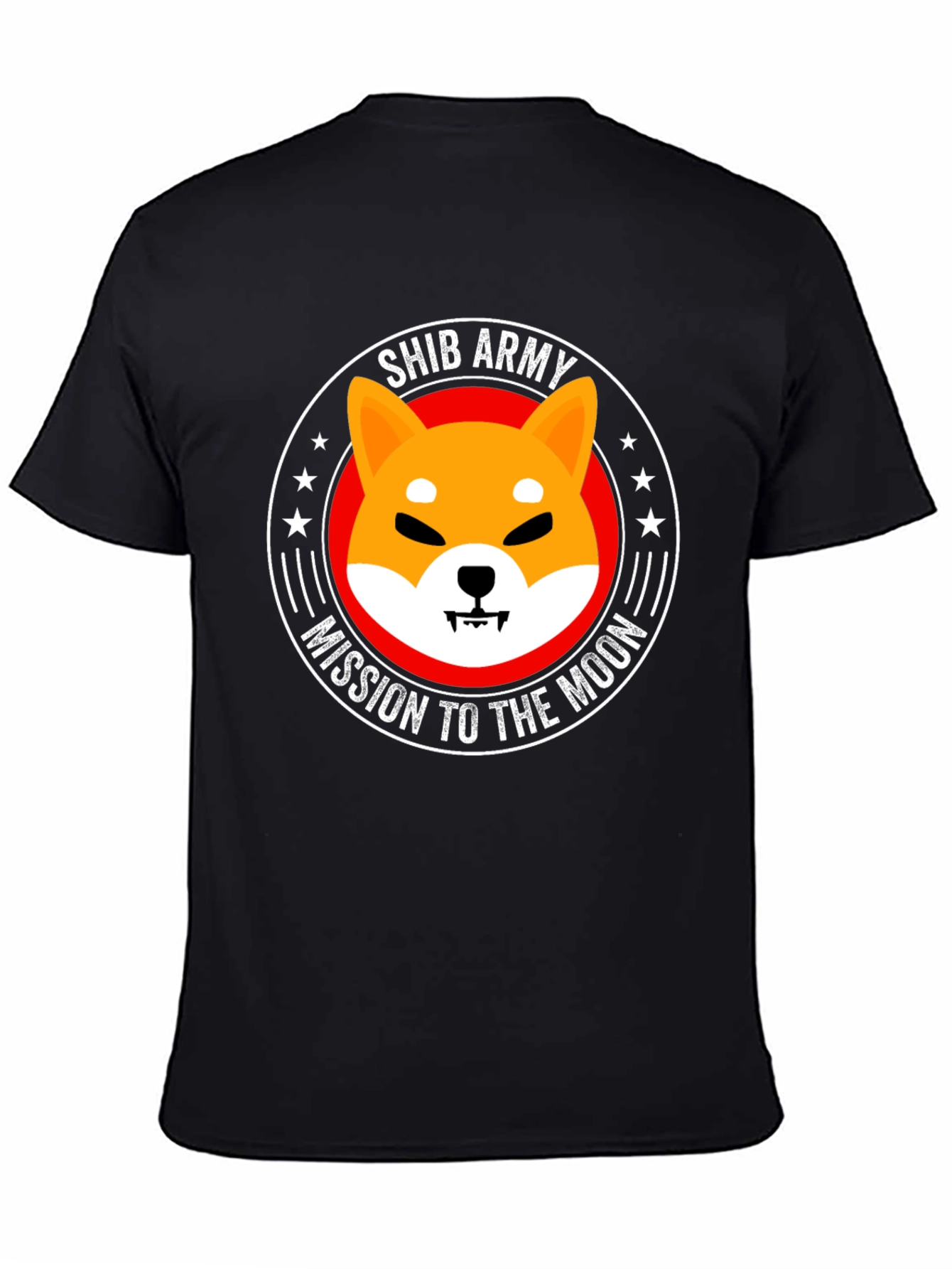 Show your support with this bold black t-shirt. Featuring the iconic Shiba Inu dog graphic inside a circular emblem that reads "SHIB ARMY" and "MISSION TO THE MOON". Constructed from what appears to be a soft, breathable fabric, this tee offers both comfort and style. The eye-catching graphic is perfect for casual wear, crypto meetups, or as a statement piece. Let everyone know you're part of the Shib Army! A great conversation starter for crypto enthusiasts.