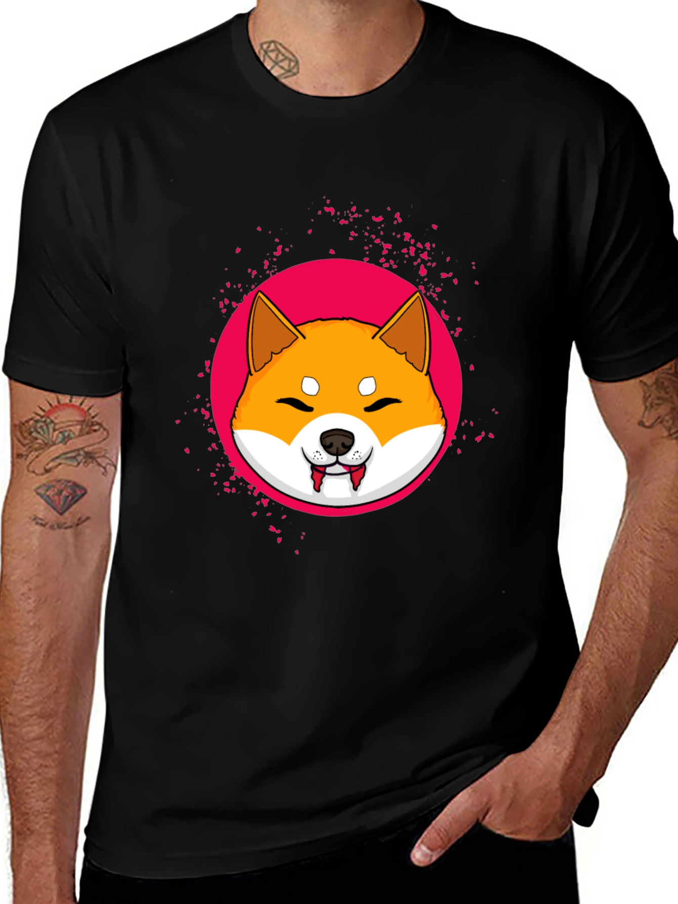 Show off your love for Shiba Inus with this unique graphic t-shirt. This black tee features a vibrant print of an adorable Shiba Inu with a vampire twist, set against a bright pink circle. The design is eye-catching and playful, making it a great conversation starter. Made from a soft and comfortable fabric, this t-shirt is perfect for everyday wear. Whether you're a dog lover, a fan of unique designs, or just want to add a touch of fun to your wardrobe, this Shiba Inu Vampire T-Shirt is a must-have. It's ideal for casual outings, themed parties, or simply relaxing at home. Get yours today and let your style stand out!