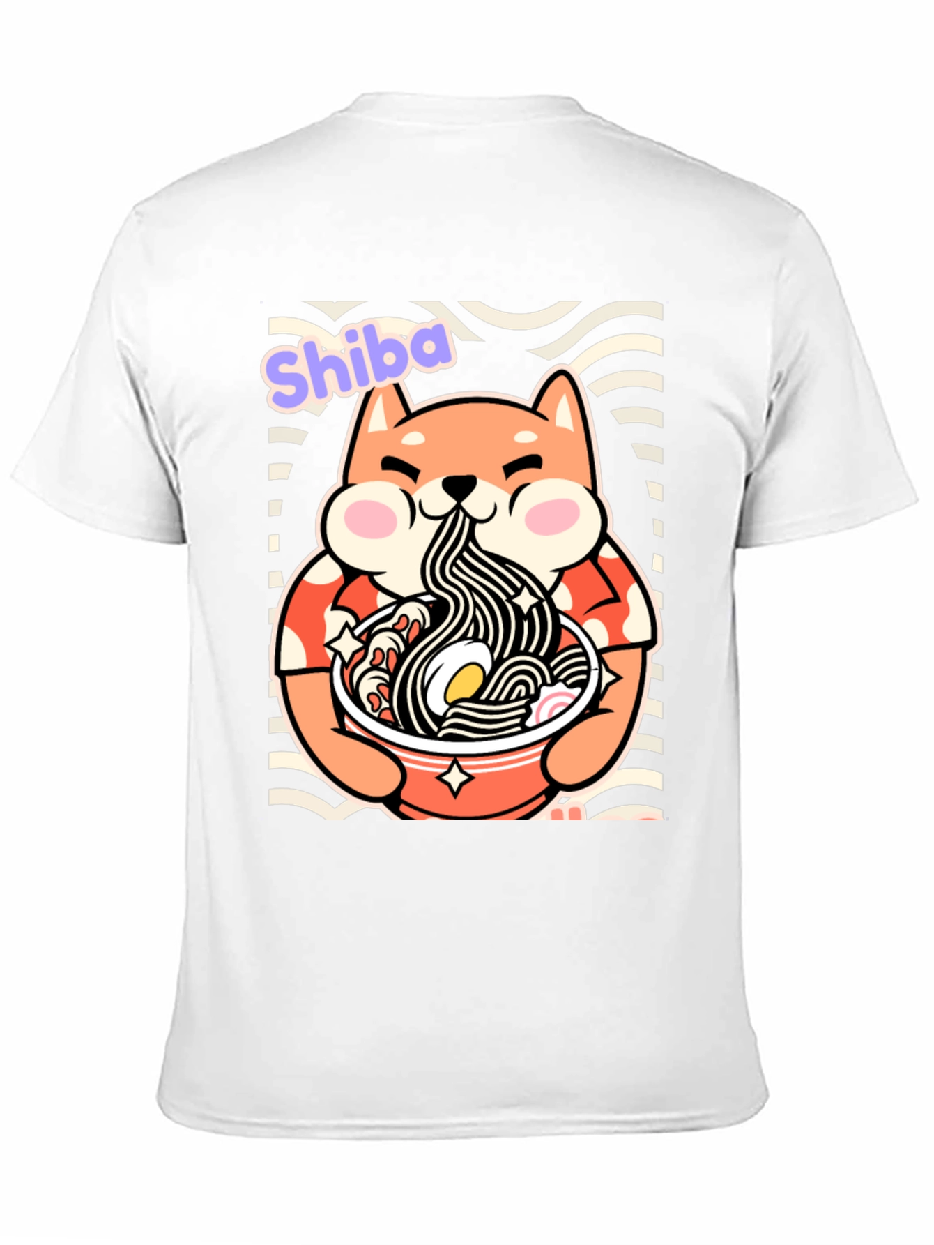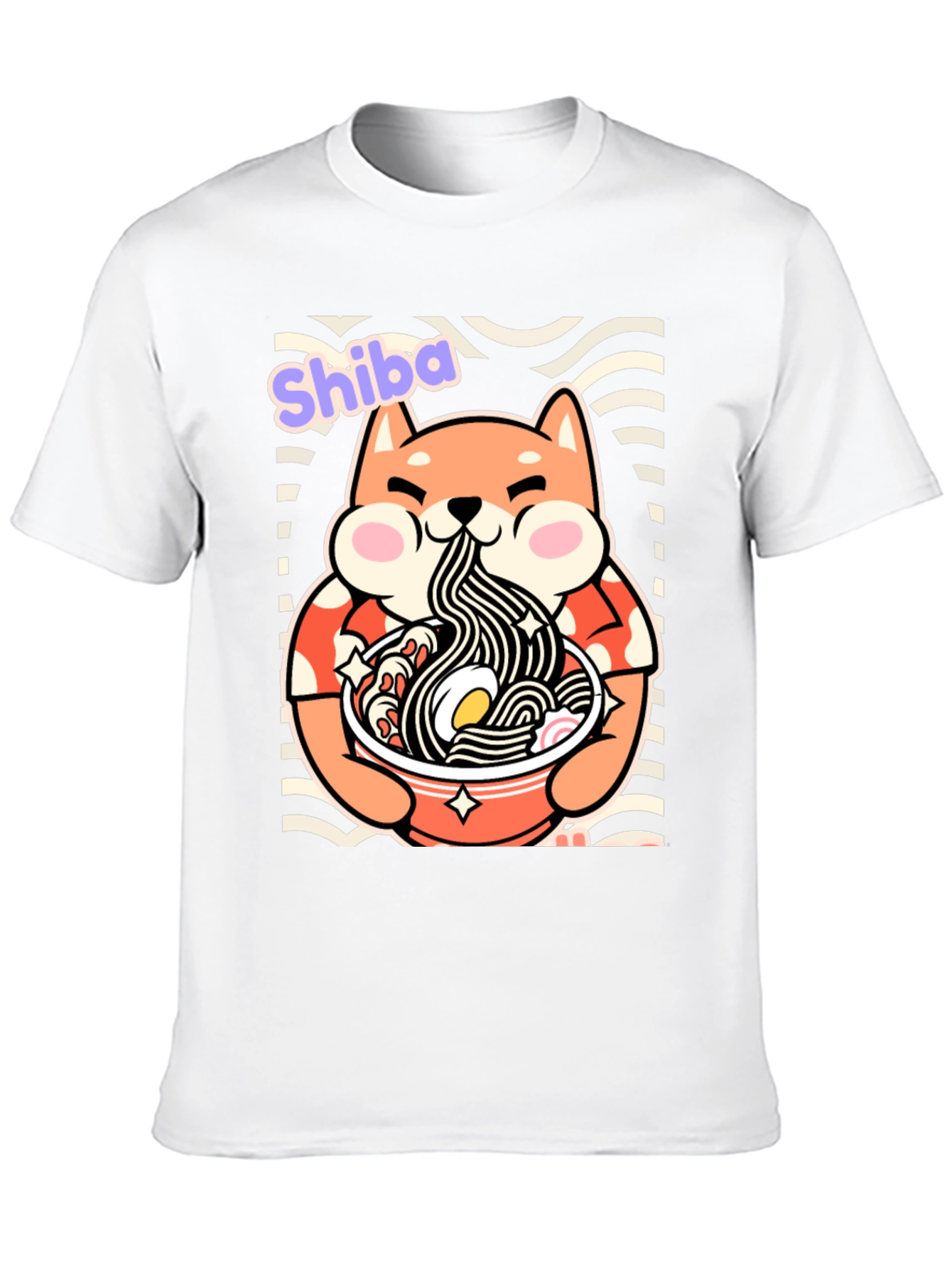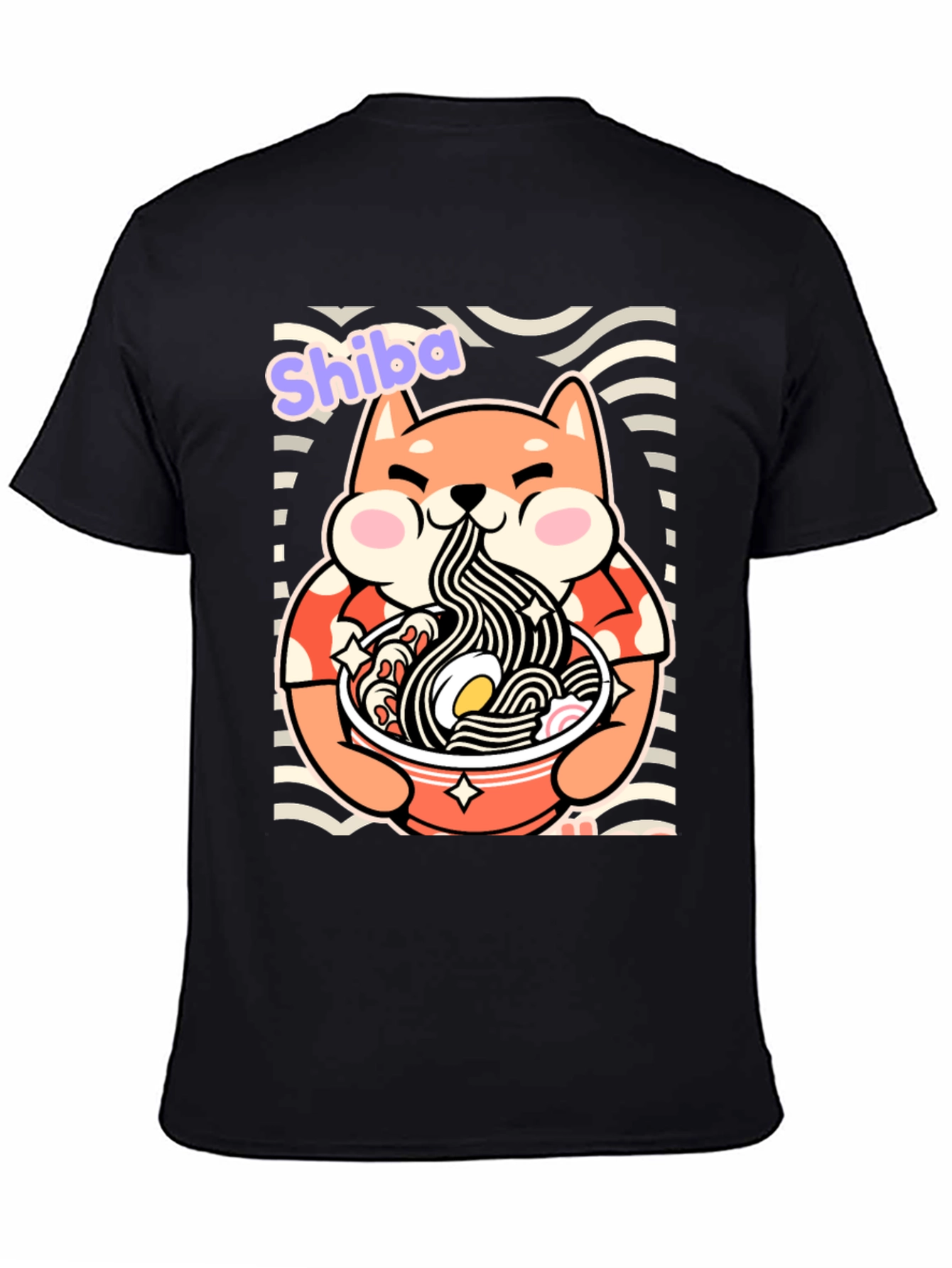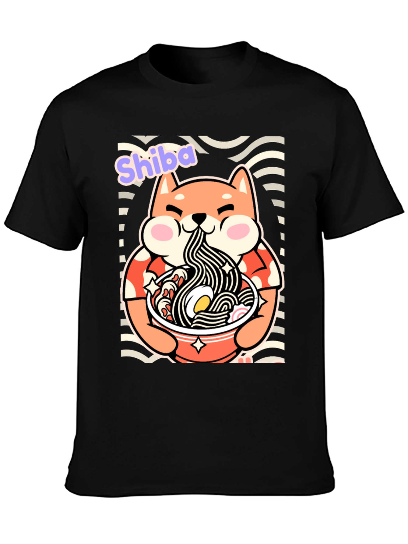 This trendy black t-shirt features an adorable graphic of a Shiba Inu enjoying a bowl of ramen. The design showcases a cute Shiba holding a brimming bowl of noodles, complete with toppings, against a wavy background. The word 'Shiba' is playfully printed above the design. Made from comfortable material, this tee is perfect for casual wear, showcasing your love for dogs and Japanese cuisine. It's an eye-catching and unique piece that adds fun to any outfit. Ideal for everyday wear, dog lovers, or anyone who enjoys quirky and expressive clothing. Get yours today and add a touch of Shiba charm to your wardrobe!